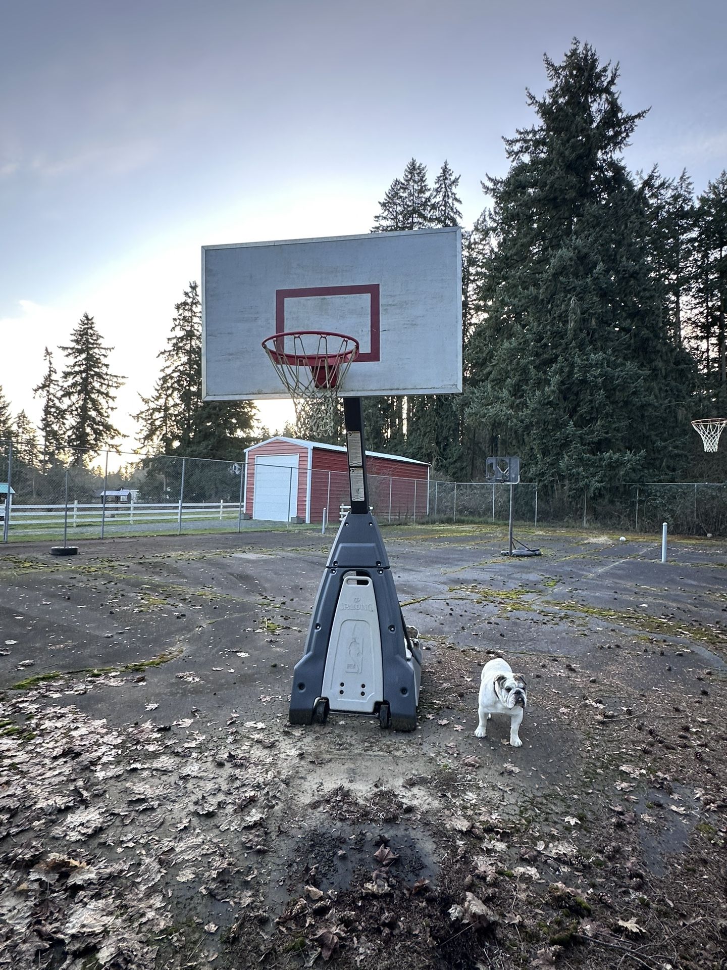 Adjustable height, weighted base fills with water or sand. Has wheels to move or roll. Changeable net. Free rolling ball rack holds 15 basketballs.