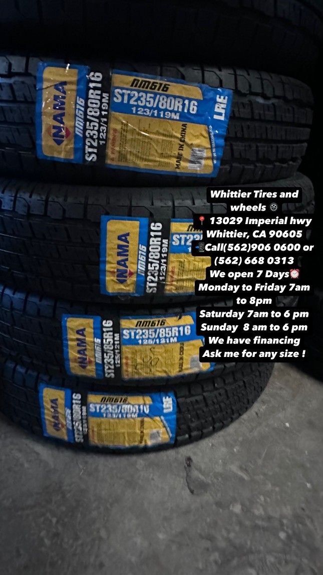 WHITTIER TIRES 13029 IMPERIAL HWY WHITTIER CA 90605 CALL (562)906-0600 TEXT (562)413-6926 - WE HAVE THE BIGGEST USED & NEW TIRE INVENTORY AVAILABLE, ASKS US FOR ANY SIZE YOU NEED. FINANCING OPTIONS AVAILABLE, 90 DAY NO INTEREST! HABLAMOS ESPAñOL. OPEN MONDAY-FRIDAY 7AM-8PM, SATURDAY 7AM-6PM, SUNDAY 8AM-5PM 185/65/14 175/65/15 185/55/15 185/65/15 195/65/15 205/55/16 215/55R16 215/60/16 205/65/16 245/75/16 265/70/16 285/75/16 265/75/16 215/45/17 225/45/17 225/50/17 215/50/17 215/55/17 235/65/17 245/65/17 255/65/17 265/70/17 285/70/17 33x12.50r17 215/45/18 225/40/18 235/40/18 235/45/18 245/45R18 235/60/18 245/60R18 265/60/18 255/70/18 265/70/18 33x12.50r18 225/40/19 235/40/19 245/40/19 245/45/19 245/35/20 245/45/20 245/50/20 255/50/20 265/50/20 275/55/20 275/60/20 33x12.50r20 35x12.50r20 37/13.50R20 265/35/22 285/45/22 305/40/22 305/45R22 33x12.50R22 295/35/34 305/35R24 ESPECIAL DE LLANTA NUEVA Y USADA GOODYEAR MICHELING BRIDGESTONE FIRESTONE CONTINENTAL ARROYO YOKOHAMA PIRELLI KUHMO TOYO ATLANDER LANDGOLDEN LANDSPIDER LLANTAS TIRES WHEELS