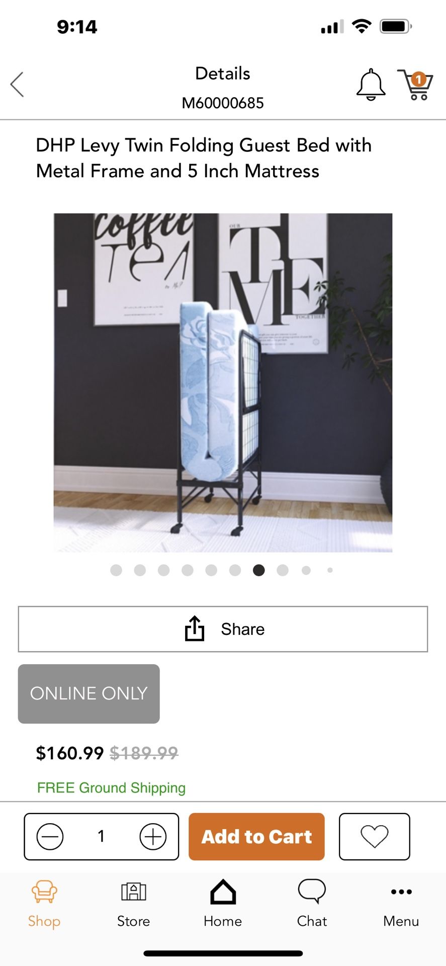 Purchased from Ashley furniture. Memory foam twin mattress. On wheels and very compact. Fits in closet.