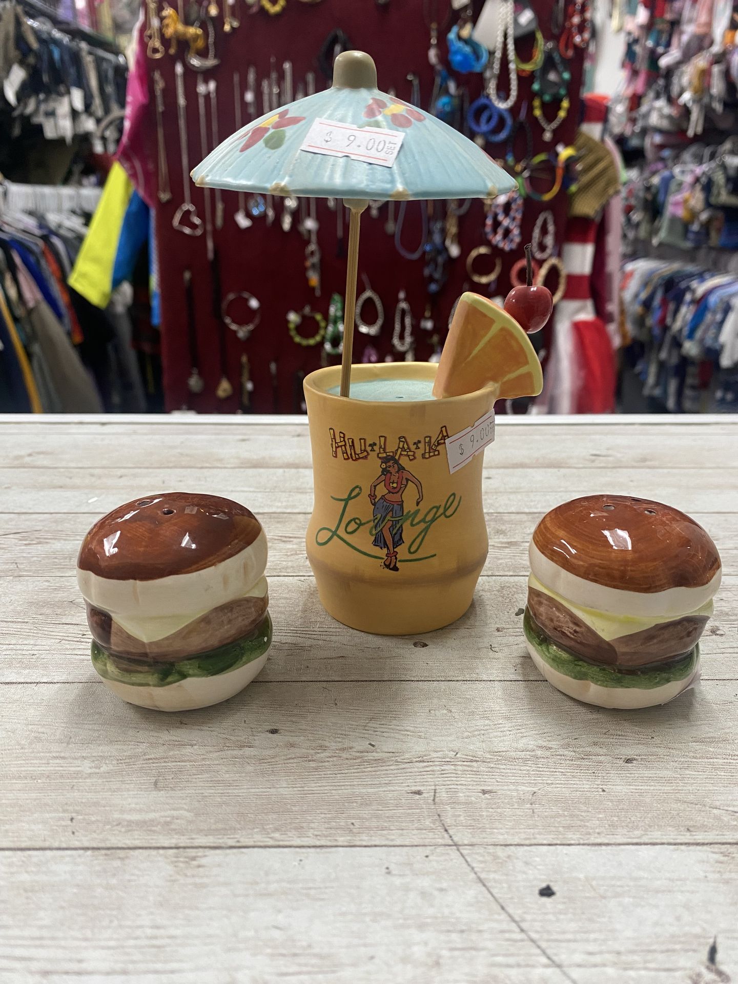 This Tropical drink and cheeseburger salt and pepper shakers are fun and functional shakers for that unique experience. Magical New Beginnings Thrift Store. The Thrift Store Above! Come visit us and get a great deal. New, Like New and Preloved items updated daily! 514 S. Smith B113 Corona CA TUESDAY- SATURDAY 11am-7pm Some restrictions may apply $9 items and under +tax