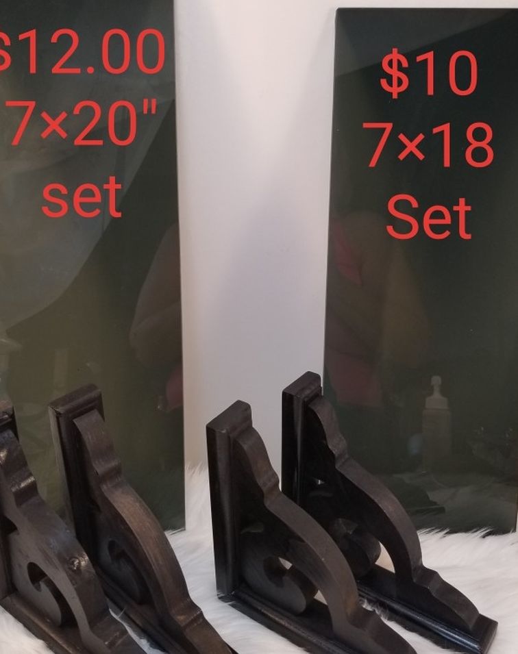 $10-7×18" Shelf set $12-7×20" shelf set EACH Wood pieces 7x7" See photos for shelf details