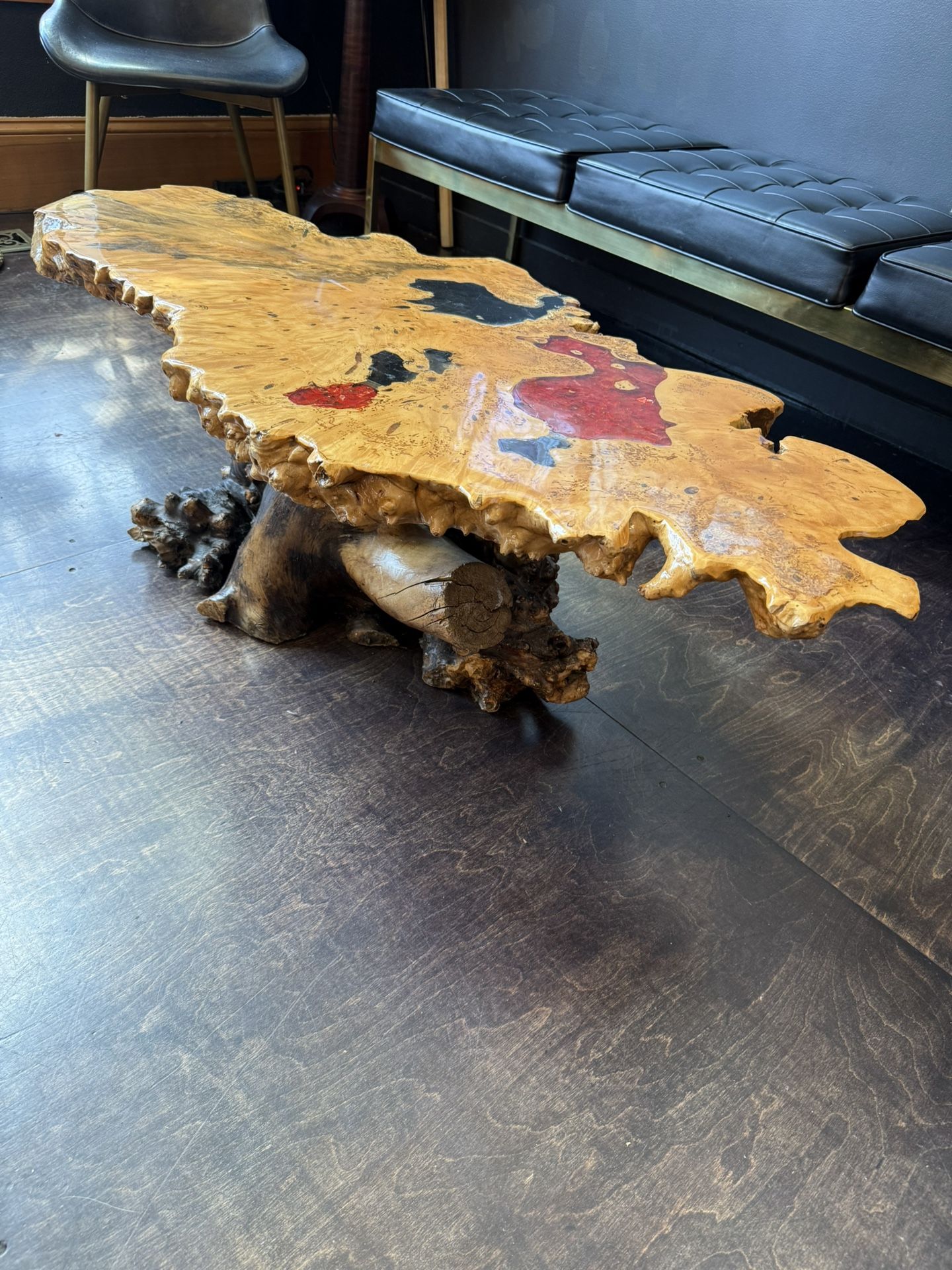 This is a solid, vintage table in great shape. No major flaws. Unique resin design in the wood. Item is located at Kenton Antiques in North Portland. Please contact the owner, Mo, at (contact info removed). 48” long 22“ wide 15 1/2” tall