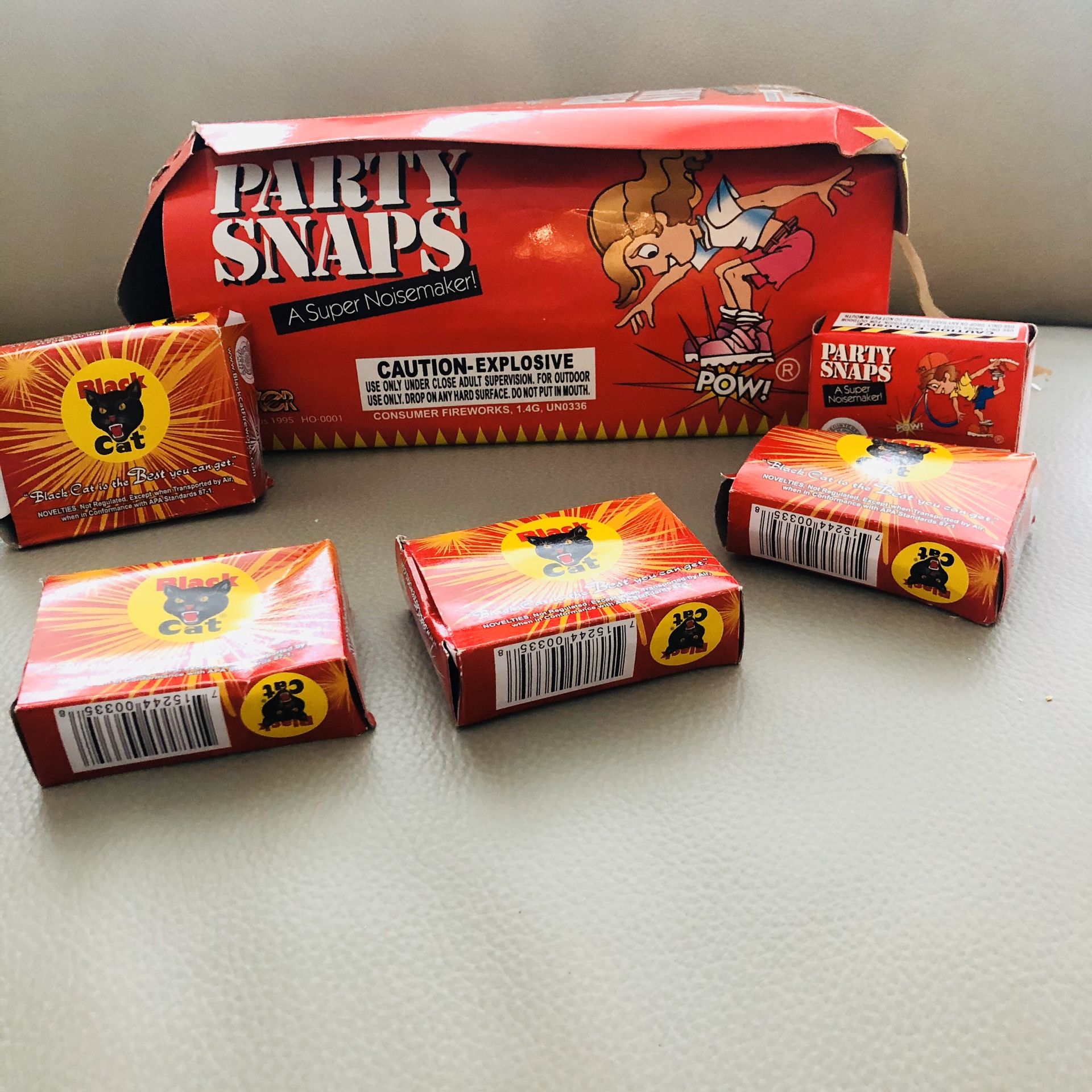 Open box of individual boxes party snaps. 30 individual wrapped party snaps 4 individual wrapped black cat snaps