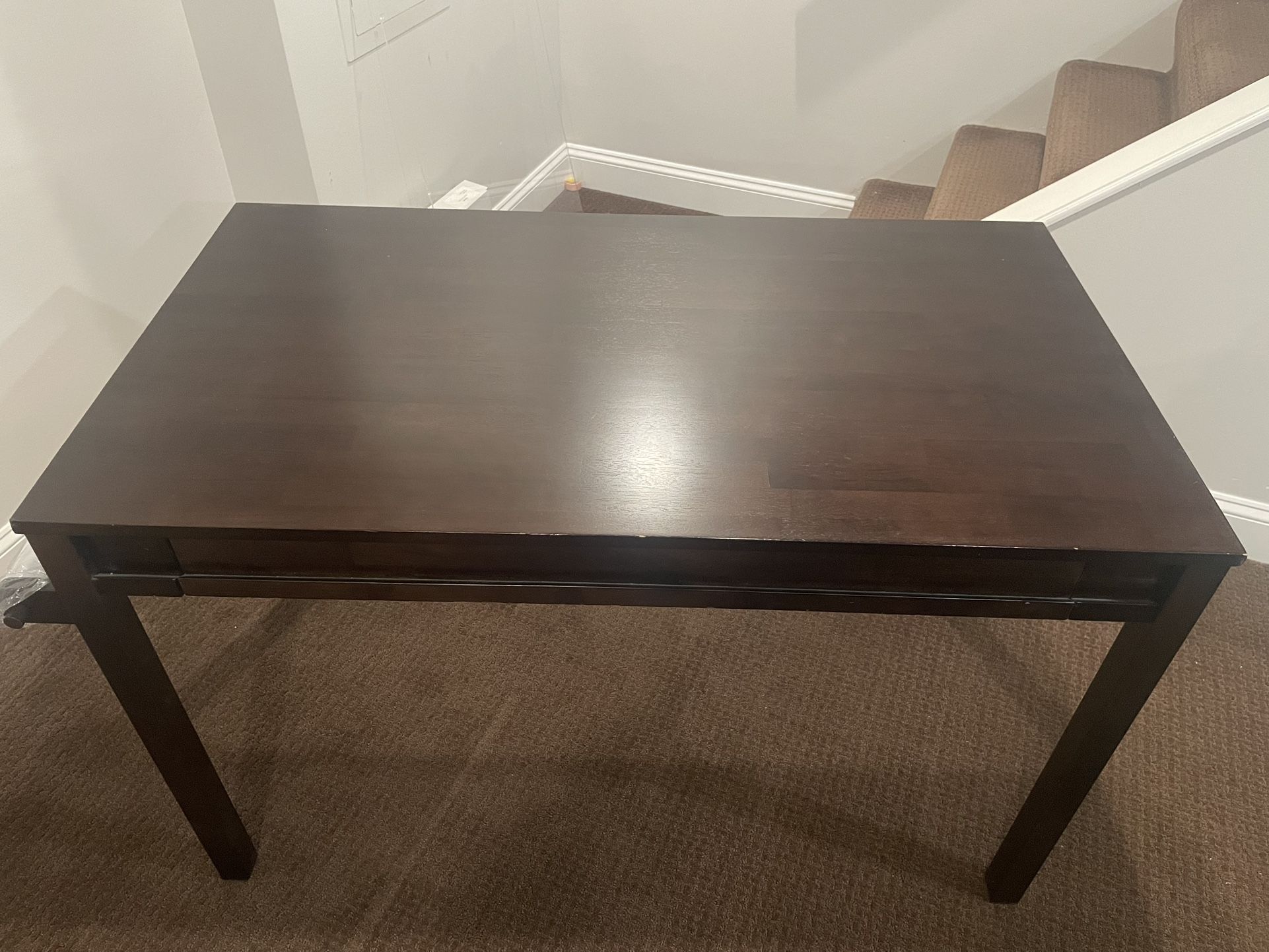 Dark wood desk with two chairs. Desk has one long drawer in the front, a plexiglass removable top, and an art paper spool on the side (new roll of paper) Two sets of legs allowing the height of the desk to adjust based on your needs. Easy to adjust Dimensions Desk top 48” x 27” 29” legs / 30” height 22” legs / 23” height Chair seat height 14” Gently used. Pick up only Will disassemble and assist with loading.