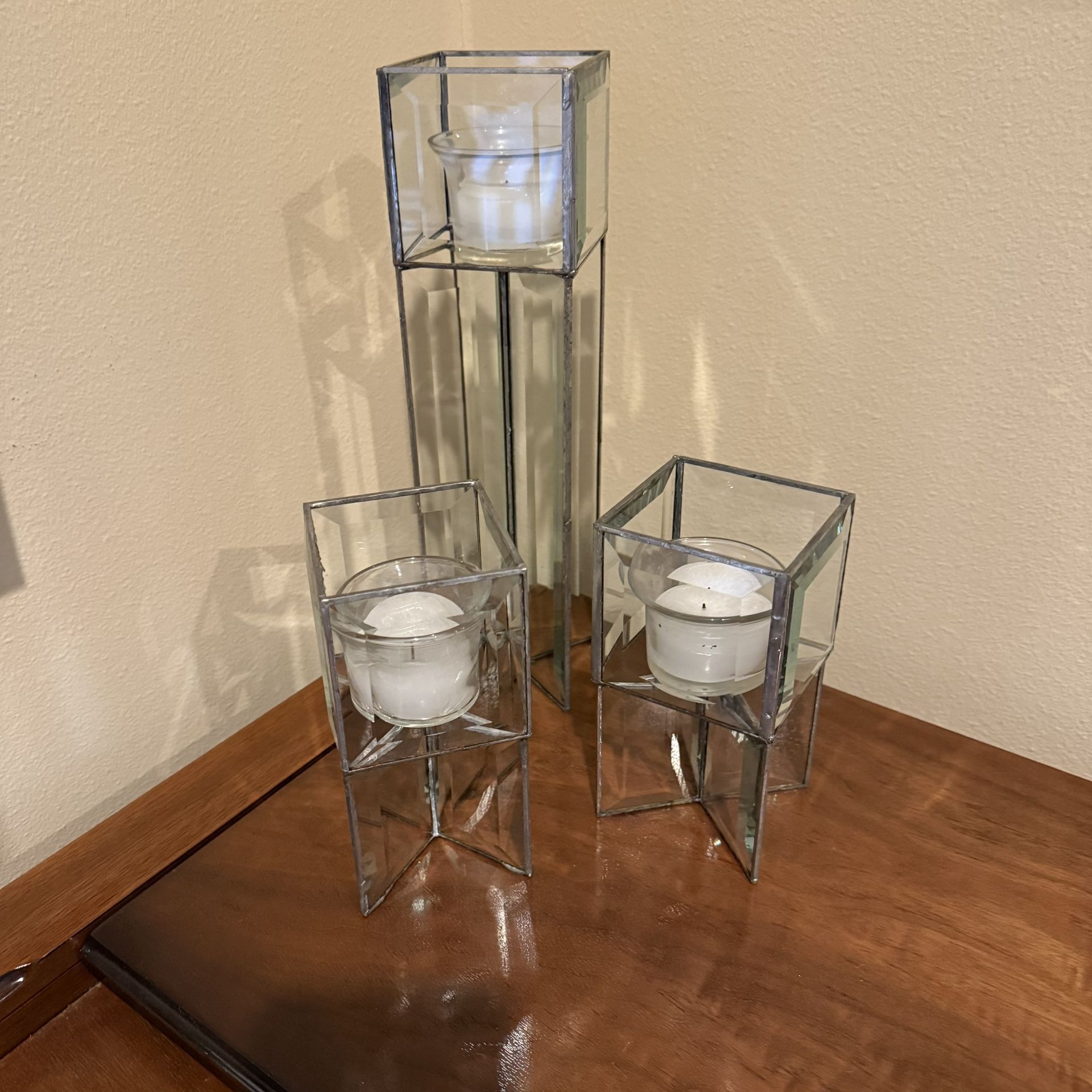 Porch pick up Woodinville. Bundle with other items & make an offer! Elegant modern candle holder set featuring clear glass cubes on metal stands in three different heights. Minimalist, contemporary design looks great on a dining table, console, mantel, or shelf styling. Includes glass inserts for tea lights or small votive candles (candles shown included if desired). • Set of 3 • Varying heights for visual interest • Glass & metal construction • Clean, modern / contemporary style • Great condition – no cracks or chips Perfect for modern, transitional, or minimalist décor