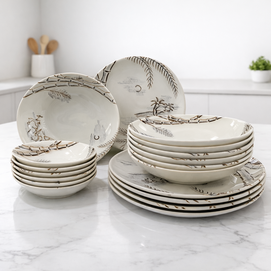 Authentic Harmony House “Caribbean” 19-piece dinnerware set in Dawn Gray and Spice Brown underglaze, made in Japan. Features the iconic tropical island, bamboo, canoe, and palm tree motif highly associated with mid-century modern design. This original vintage set includes dinner plates, soup/pasta bowls, smaller bowls, and a serving bowl. Glossy glaze with crisp artwork and strong color. No cracks or structural damage observed. Light utensil wear consistent with normal vintage use. A desirable collector pattern perfect for mid-century homes, tropical décor, or completing an existing Caribbean set. Rare to find in larger mixed lots. Set includes: 6 Harmony House Caribbean Dinner Plates Dawn Gray Spice K Brown 55 Japan 1 Harmony House Caribbean Dawn Gray Spice Brown 86 Serving Bowl 9” Japan 6 Harmony House Caribbean Soup Pasta Bowls 7.75” Dawn Gray Spice Brown 6 Harmony House Caribbean Fruit/dessert Plates 5.5” Stoneware Set Harmony House Caribbean pattern vintage dinnerware Japan dishes mid century tropical dishes stoneware set bamboo pattern collector dishes island dinnerware