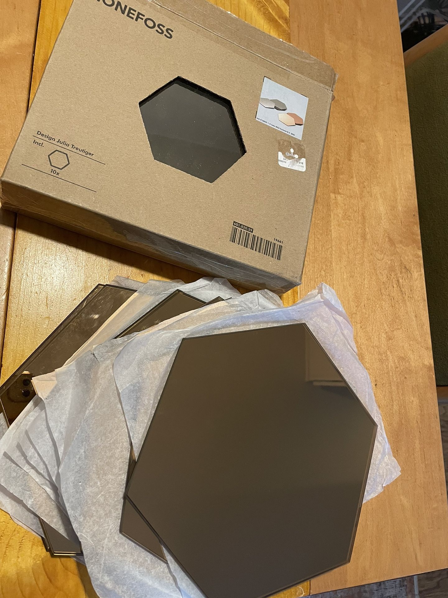 Set of 17 hexagon mirrors Honefoss Deaign Julia Treutiger Consists of 2 different brown tones on the glass, 4 are lighter, 13 are darker (see photo for color) Selling all 17 for $25 At Ikea Cost $40 +tax/ship new for 10. More info on product here: https://offerup.co/faYXKzQFnY?$deeplink_path=/redirect/