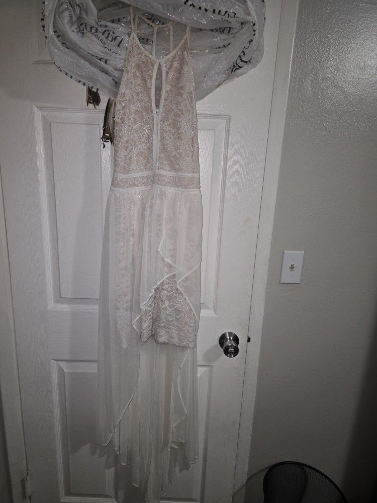 Wedding dress from Davids Bridal. Worn once hasn't been used since. It has been slightly taken in to fit me so size 10 isn't quite right. I didnt have a better picture to show the dress on but thats how it fit on me at the time.