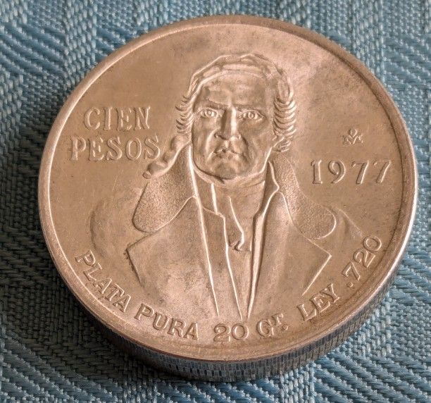 20 Mexican coins, all containing silver *3x 1977 Cien Peso .72 Ag (60g) *1x 1951 Cinco Peso .72 Ag (20g) *1x 1972 Vienticinco Peso .72 Ag (16.2g) *6x 1968 25 Pesos Summer Olympics .72 Ag (97g) *7x 1958-67 Un Peso .10 Ag (11.2g) *1x 1947 Un Peso .50 Ag (7g) *1x 1985 100 Peso Futbol .72 Ag (22.4g) Total Silver = 234 g = 7.5 oz $255 for all