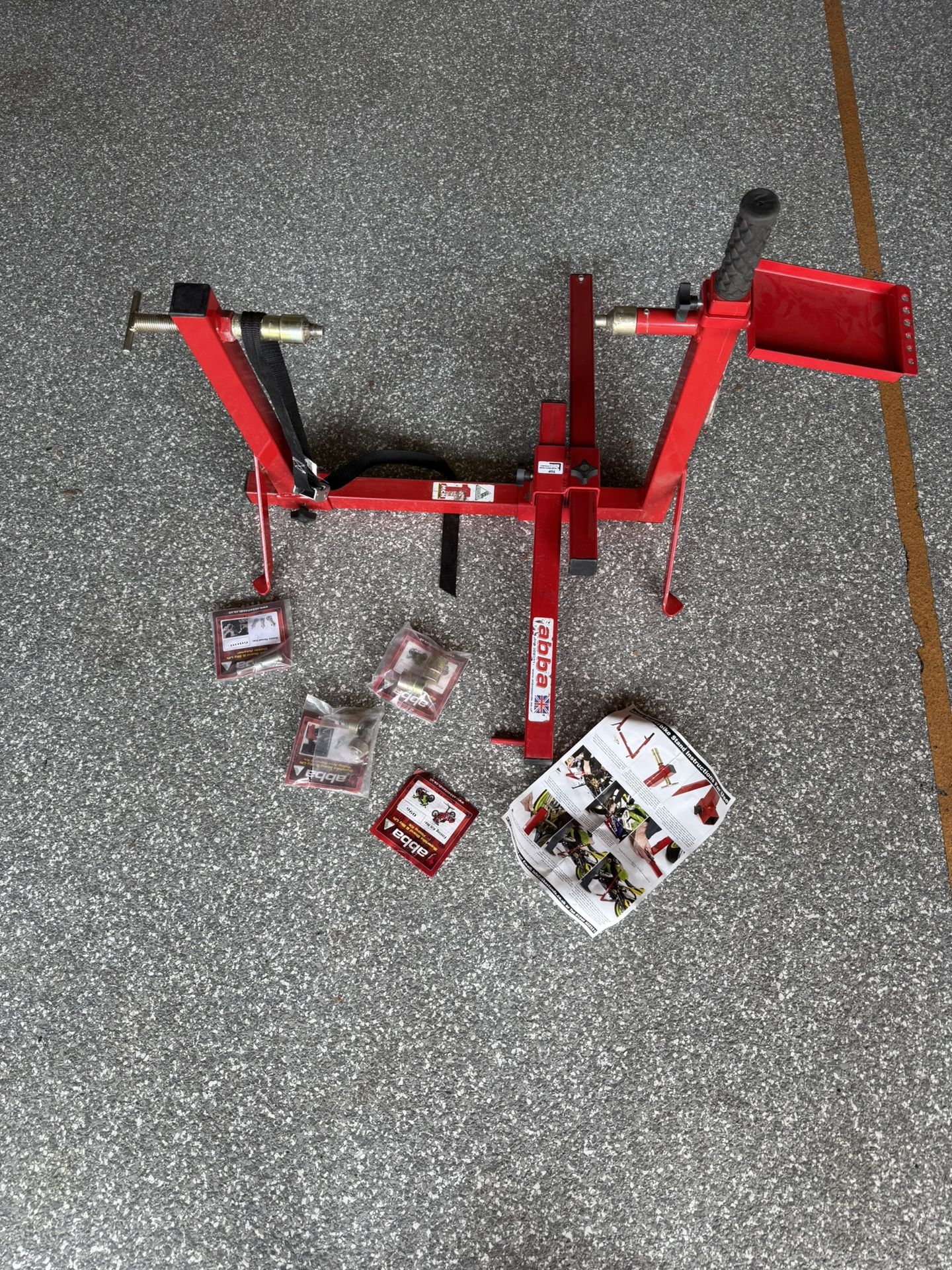 ABBA superbike front and rear kit with fit kits for Aprilia Tuono V4, Honda CB 1000, swing arm removal kit, and tool tray. Great bike lift if you like working on your own motorcycle. Used this for my Aprilia Tuono to swap wheels, remove forks, remove shock, and remove swing arm . Fit kit for CB 1000 and tool tray are still brand new and never used. I kept the bike on this stand for storage over a month as well as it kept the tires off the ground. Works great, no issues at all. Sold my Tuono and new bike has a center stand, so no longer using this.