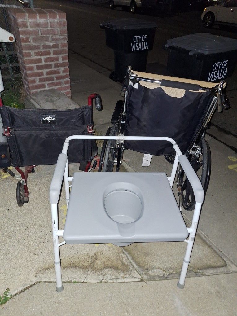 1728 West Prospect Ave Visalia 93291 Due to so many fails to be picked up. Its FCFS Nobody passed away, So if your superstitious Your good. My Mom no Longer needs these as Shes really gotten through some big humps. The Potty is Very clean! Steril! Great for up to 550lbs and there is a Plus size full size wheel chair. It does work! It does fold but I can't figure it out lol. Then there is a very petite wheel chair for smaller body shapes. Must pick up. FREE to whom needs them or your welcome to donate if you know where to do so. Everywhere I called cant pick them up. I need them picked up please.