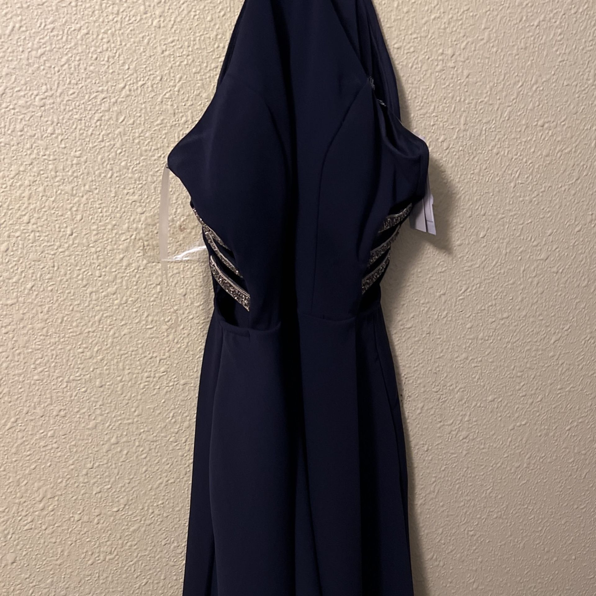 Brand new prom dress, tags still on dress, dark blue, size 5, beautiful dress, rhinestones on both sides of the dress, asking 30$ or obo