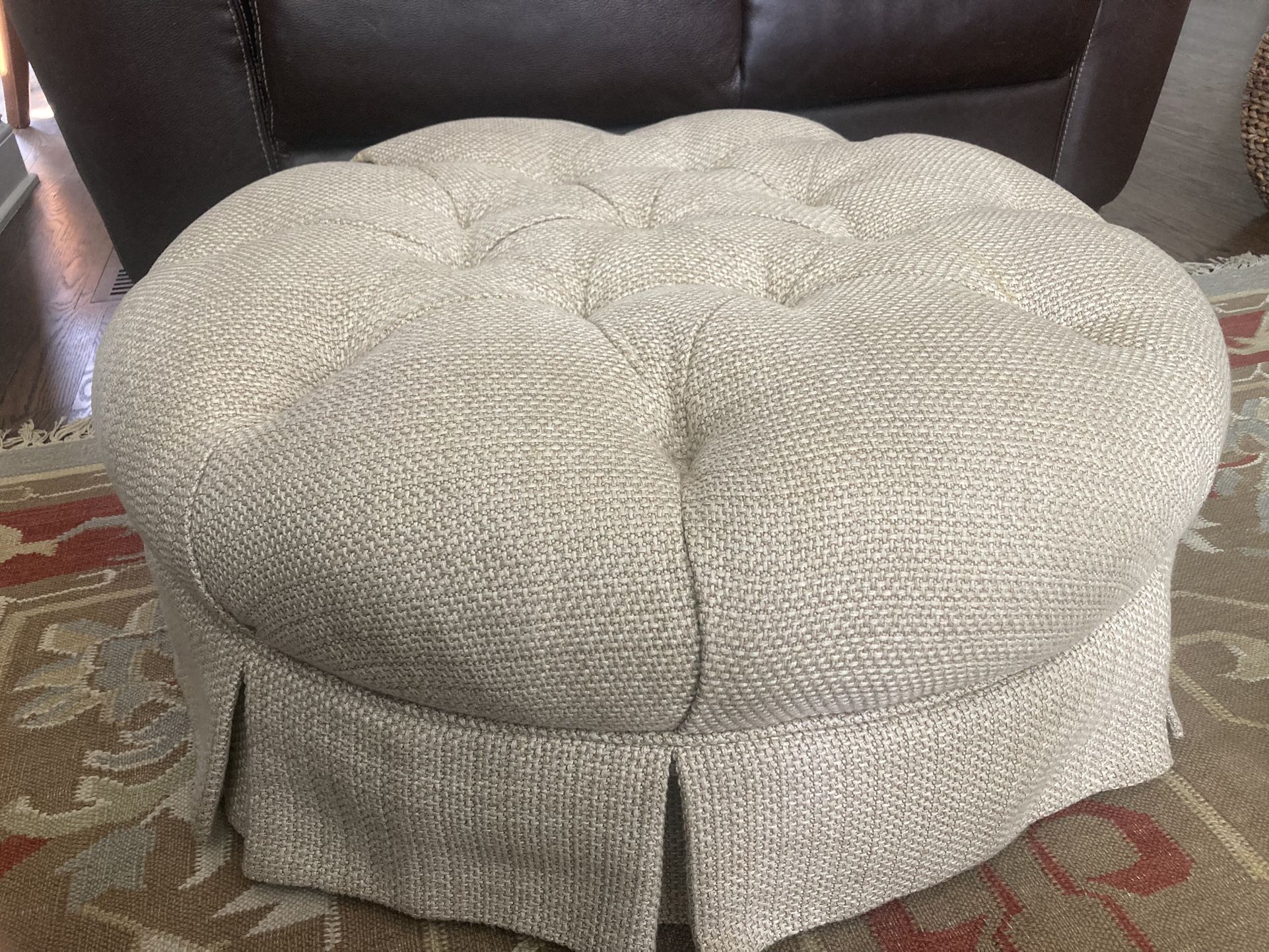 Add some comfort to any couch or chair with this neutral colored ottoman. Priced to sell! Enjoy the deal.