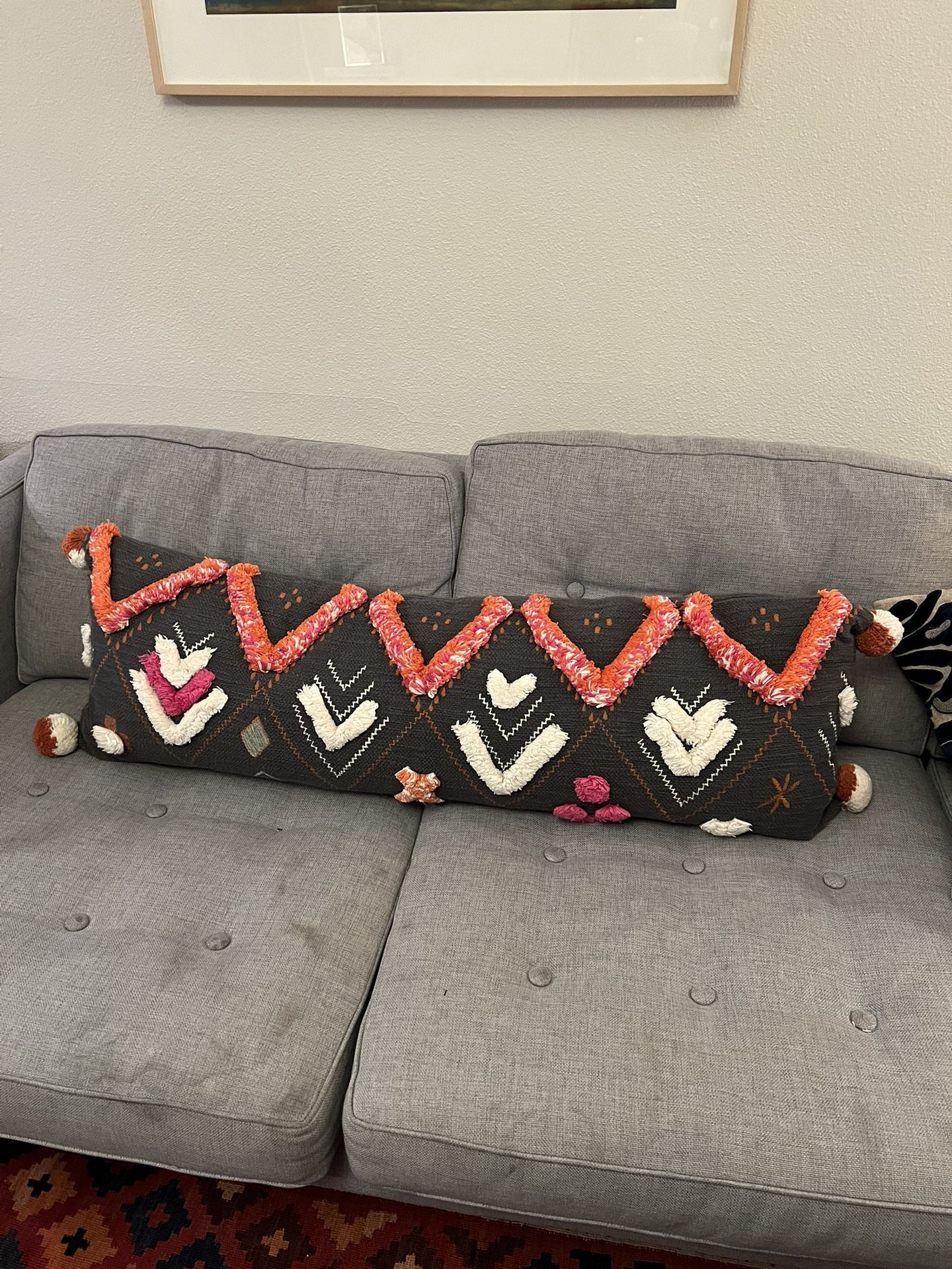 Super cute decorative pillow from Anthropologie. Bottom zip. Embroidered slubbed cotton with hand-applied acrylic embellishments. Polyfill. 14" x 40" From a dog friendly home.