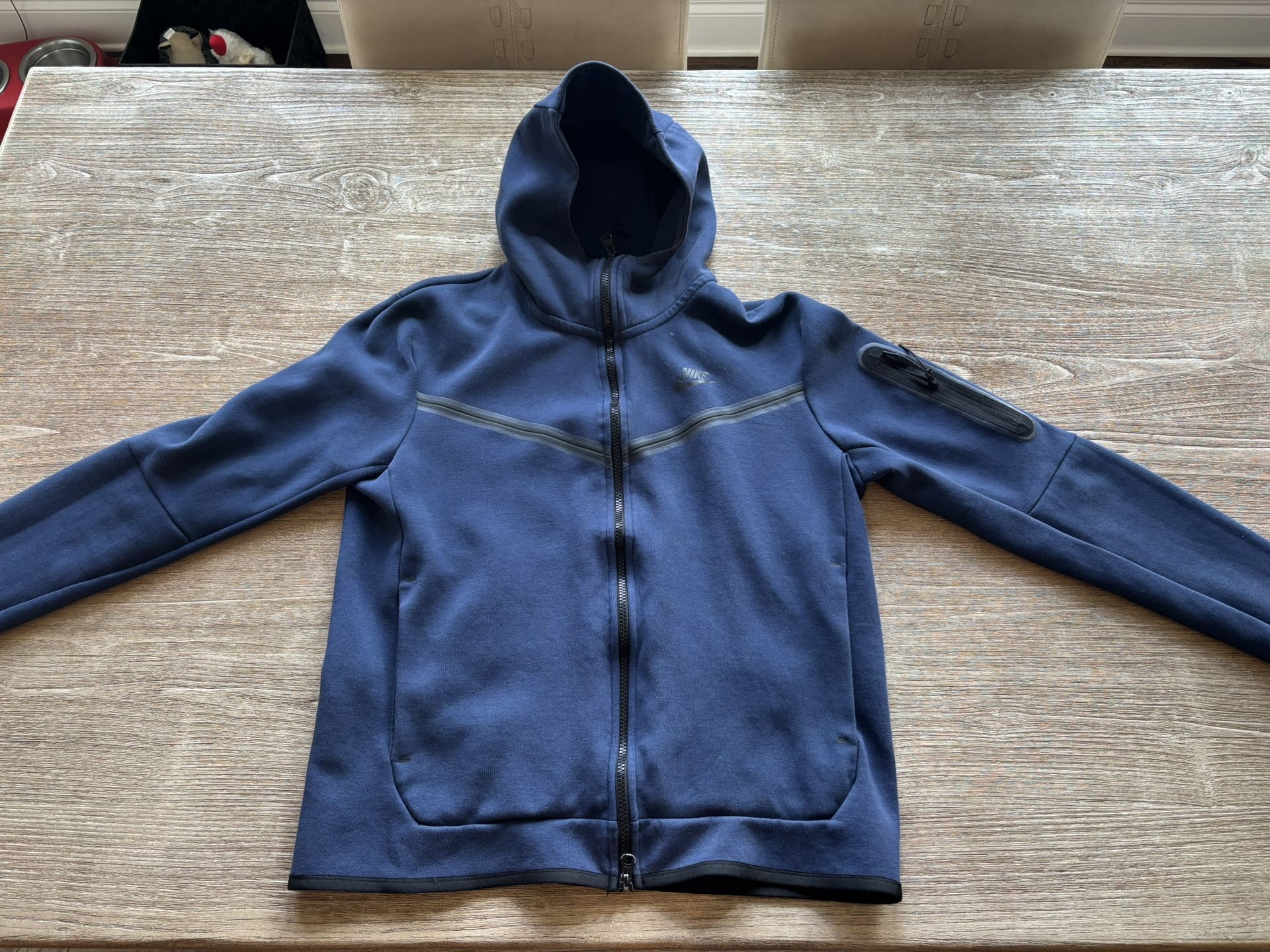 Selling my navy Nike Tech Fleece, still in great shape. No stains, rips, or anything wrong with it. Zippers work perfectly, color still looks clean, and it’s really comfortable.