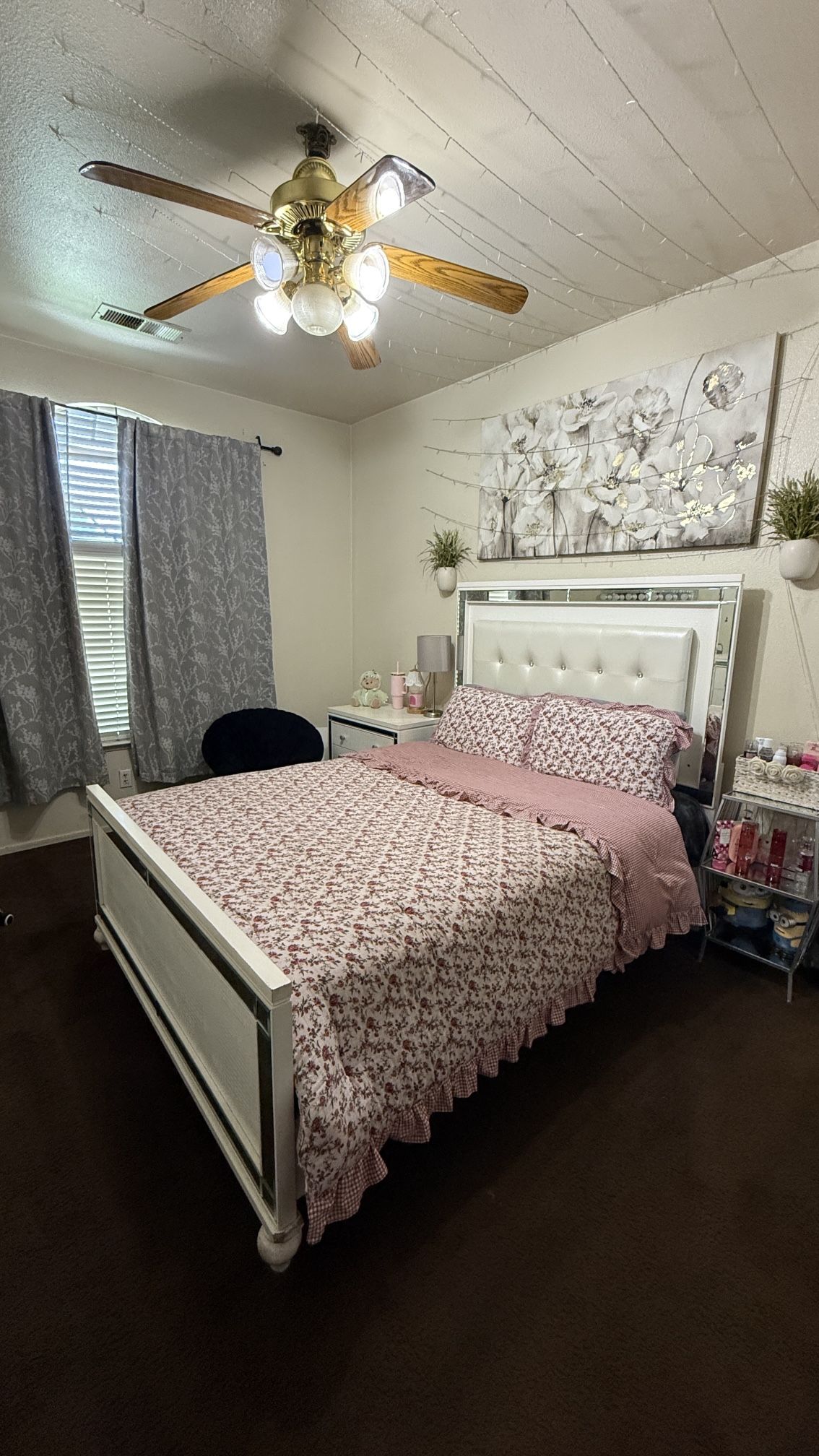 Beautiful matching bedroom set including: • Bed frame with upholstered headboard • Large dresser • Mirror • Nightstand Very solid and in good condition. Minor cosmetic wear. Selling as a full set. Asking $900 OBO. Pickup in Fresno.