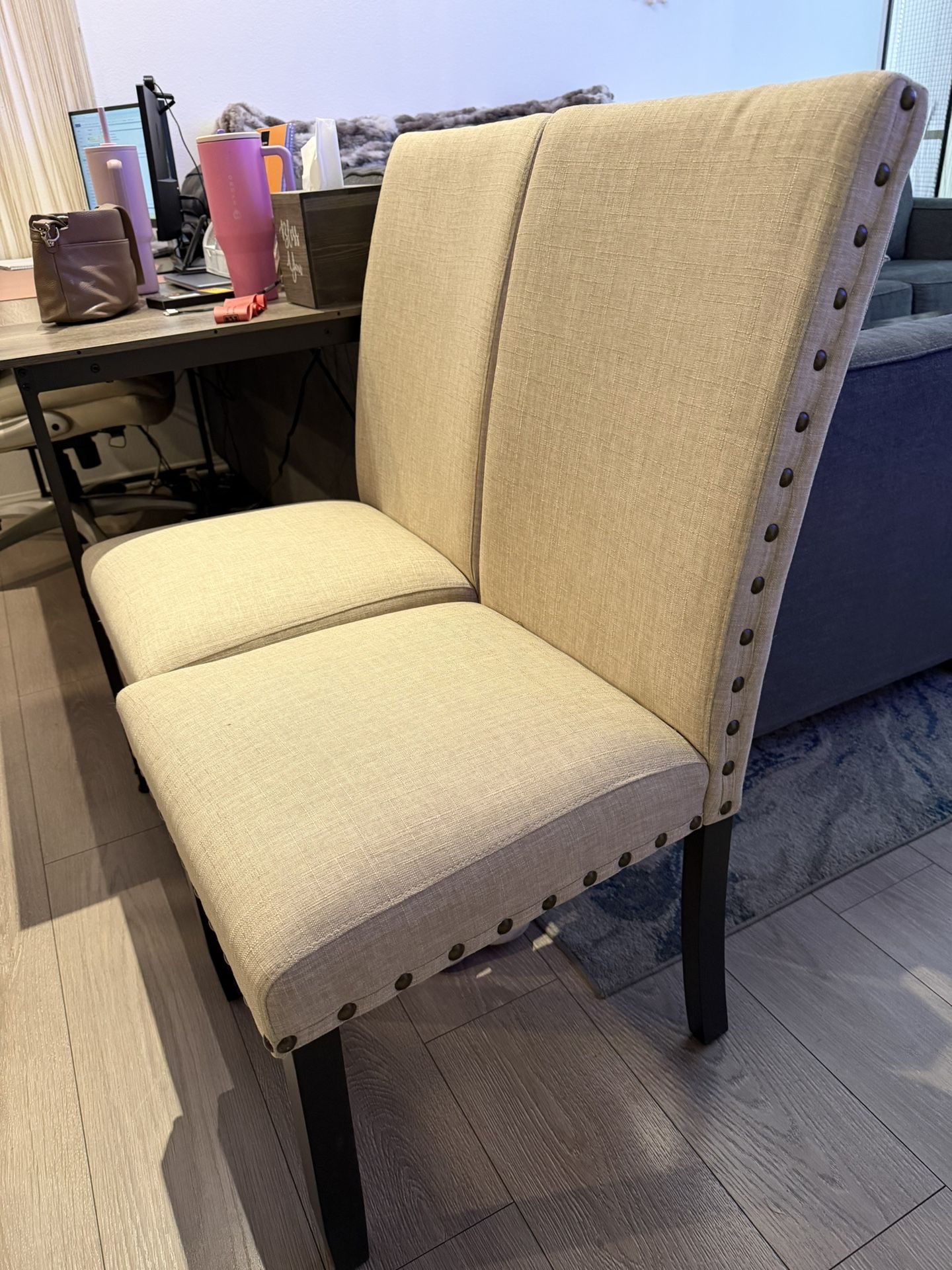 Brand new! Barley used. Started working from home and got rid of the table to put a desk there. Paid $120 for both originally from Amazon