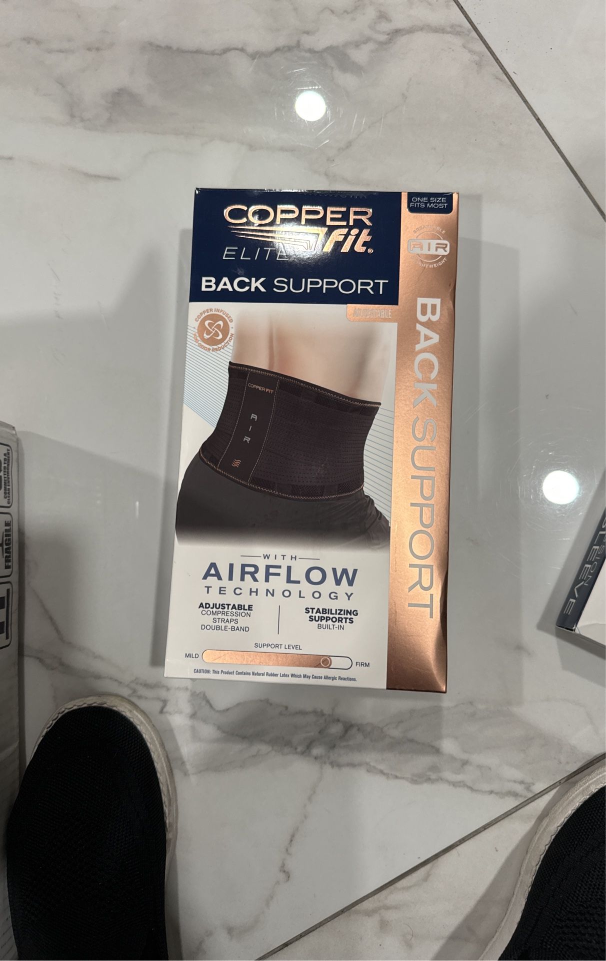 Copper Fit Elite Air Back Support Item 1740701 | Model CFEAIRBK1SZ100 Ultra AIR Flow Stays Dry, Cool and Comfortable Includes Lumbar Support Adjustable Size to Fit Waist One Size Fits Most • Double-band adjustable compression straps • Built-in stabilizing supports • Breathable and lightweight • Wearable under or over clothing • Copper infused to reduce odor • One size fits most; 30” - 50” waist