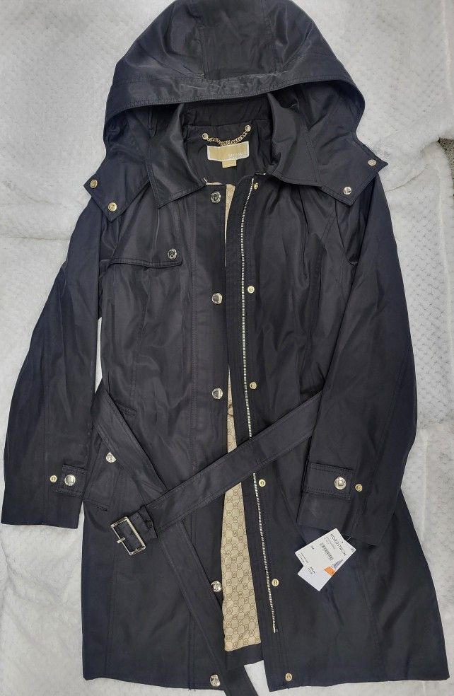Michael Kors water resistant black hooded trench coat with belt in women's size small. Hood is removable via buttons. Condition is new with tags.