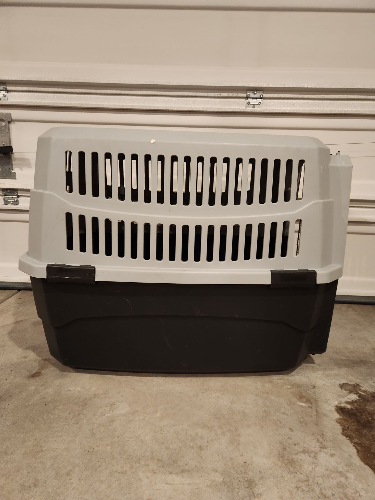 Dog crate in good condition. No screws required. H: 30" W: 24" L: 34"