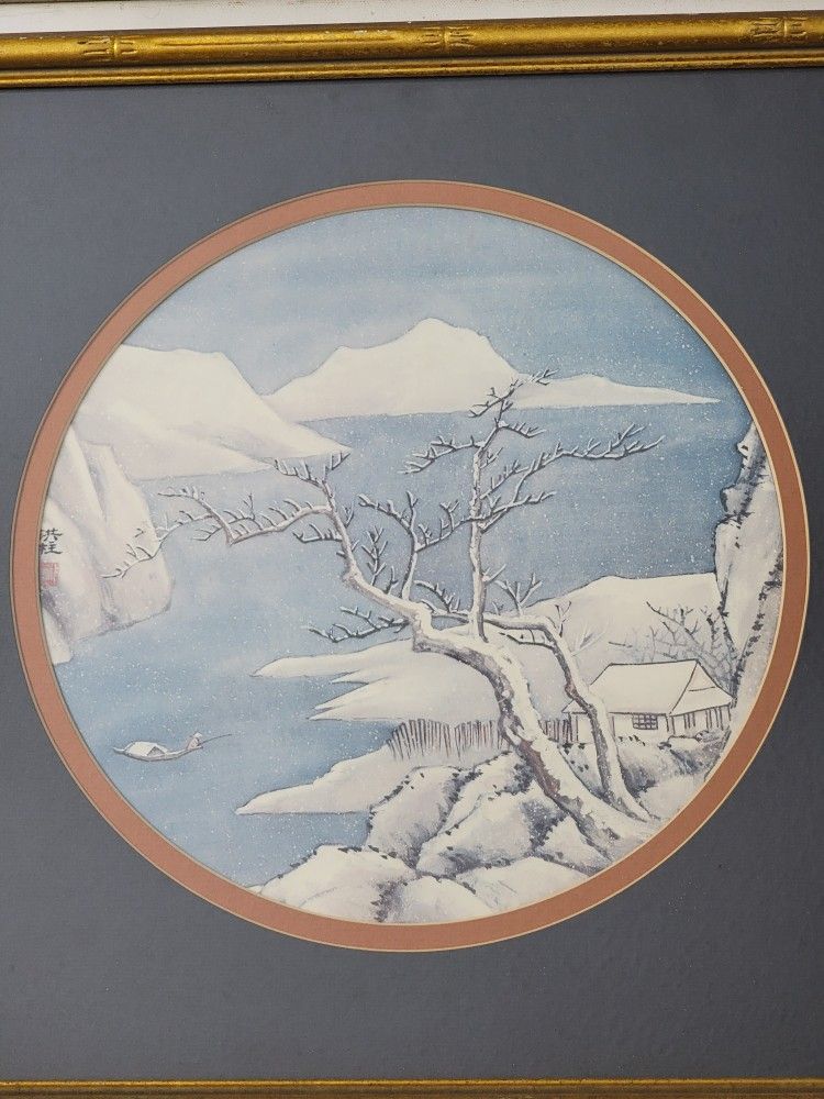 JAPANESE ART WINTER LANDSCAPE SCENE WITH SNOW. FRAME 17-1/2" X 17-1/2" X 1"