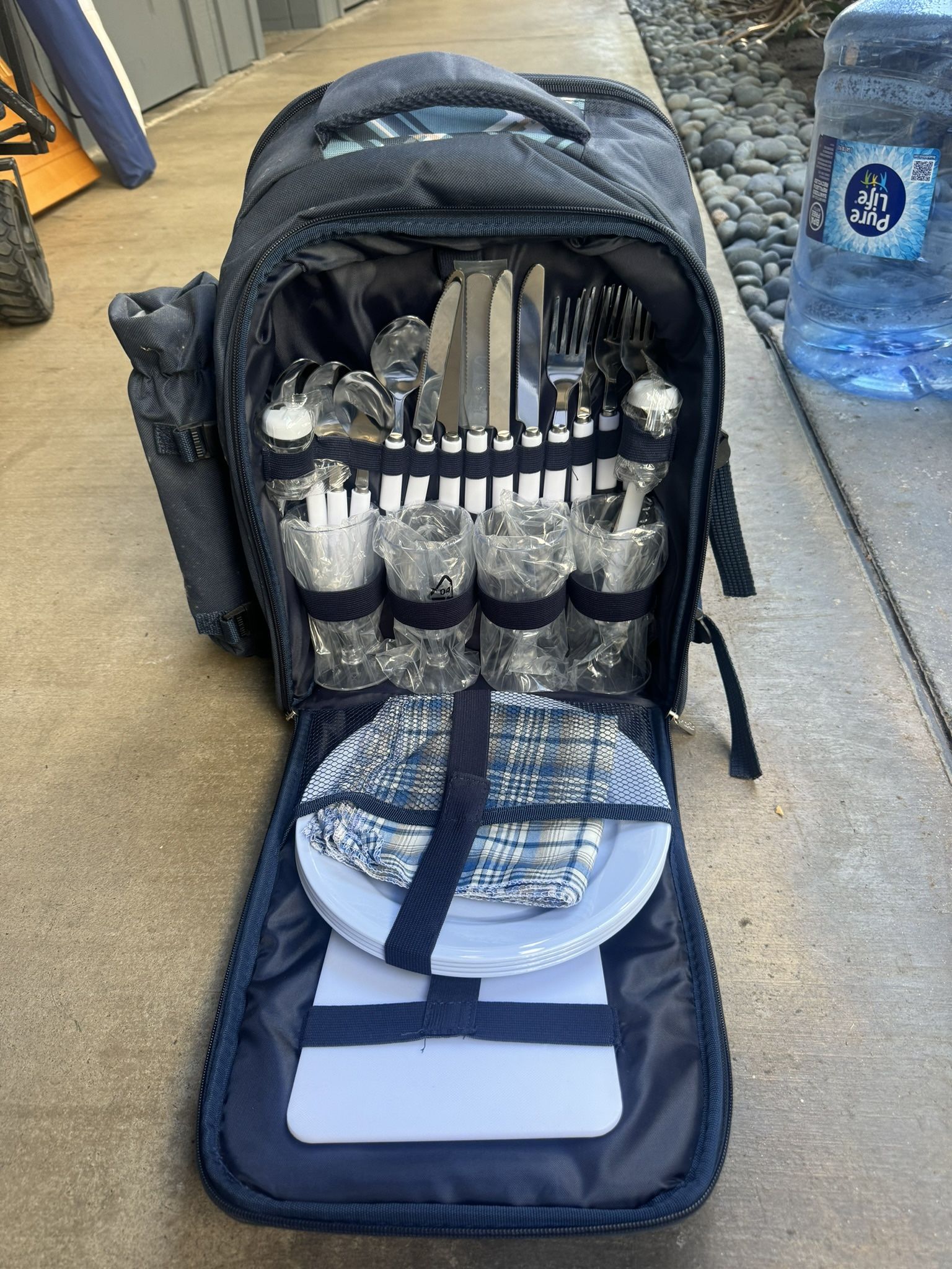 Never used Picnic backpack with blanket, wine holder, utensils, cups, plates, napkins etc