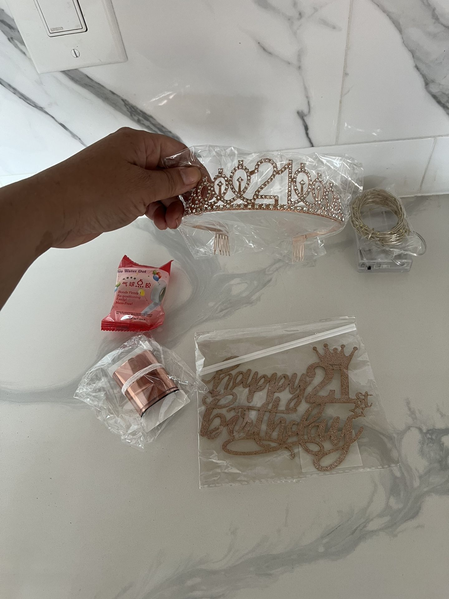 Comes with rose gold crown 21 birthday cake topper, decoration lights, glue water dots, rose gold background, 1 pack LED fairy lights battery operated. Check all pictures! Pick up at College Grove