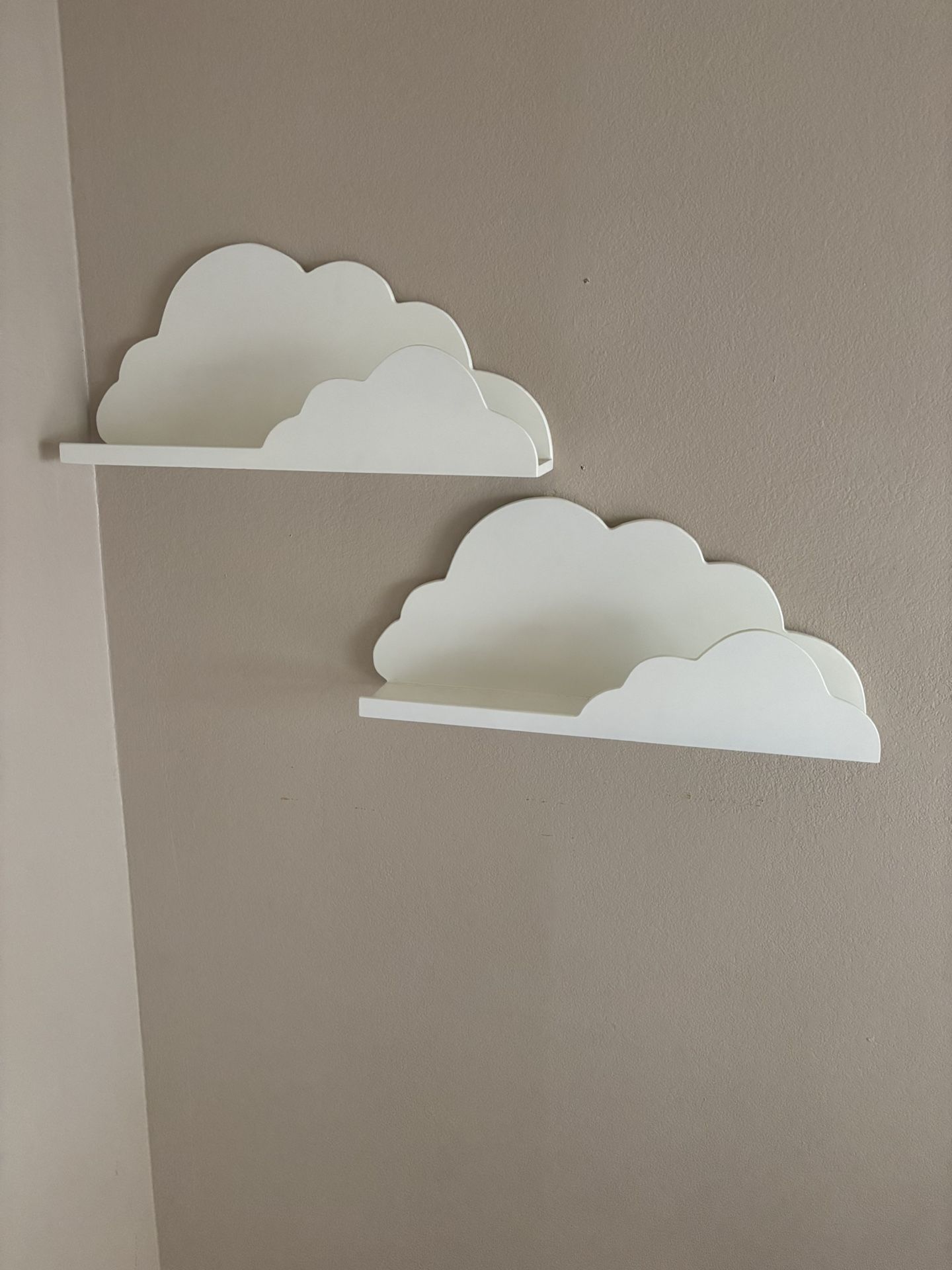 Set of two white cloud-shaped wall shelves. Perfect for a nursery, kids room, or playroom—great for books, small toys, or decor. Minimal, neutral design that works with most themes. Both shelves are in good condition with light wear from normal use. Sturdy and ready to hang. Selling as a set of two. Pickup only.