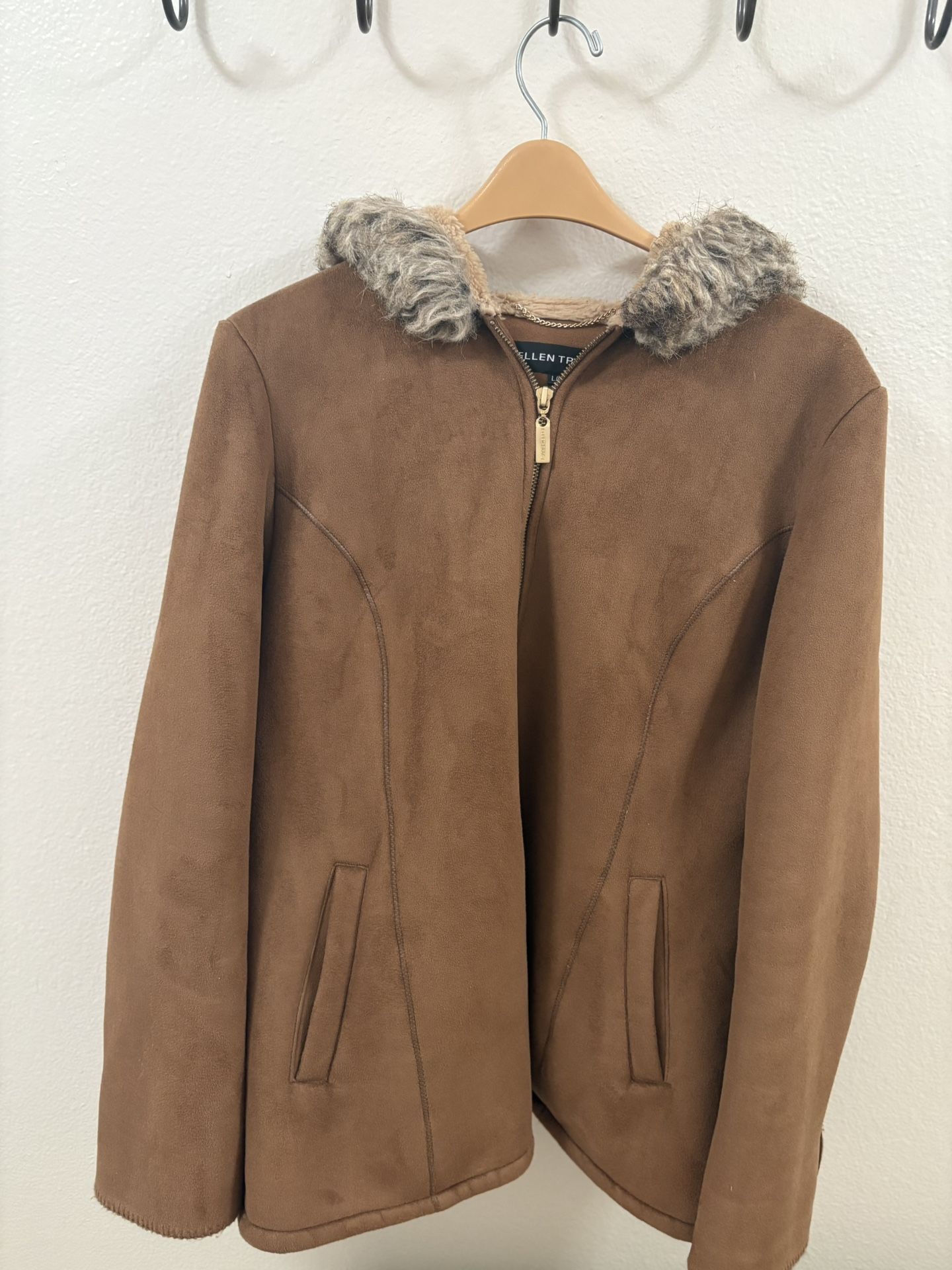 Women's Faux Suede Hooded Coat Faux Fur Hood Full-Zip with pockets Deep Tan Nice and warm and cozy 27” long, 22” pit to pit Very Good Used Condition