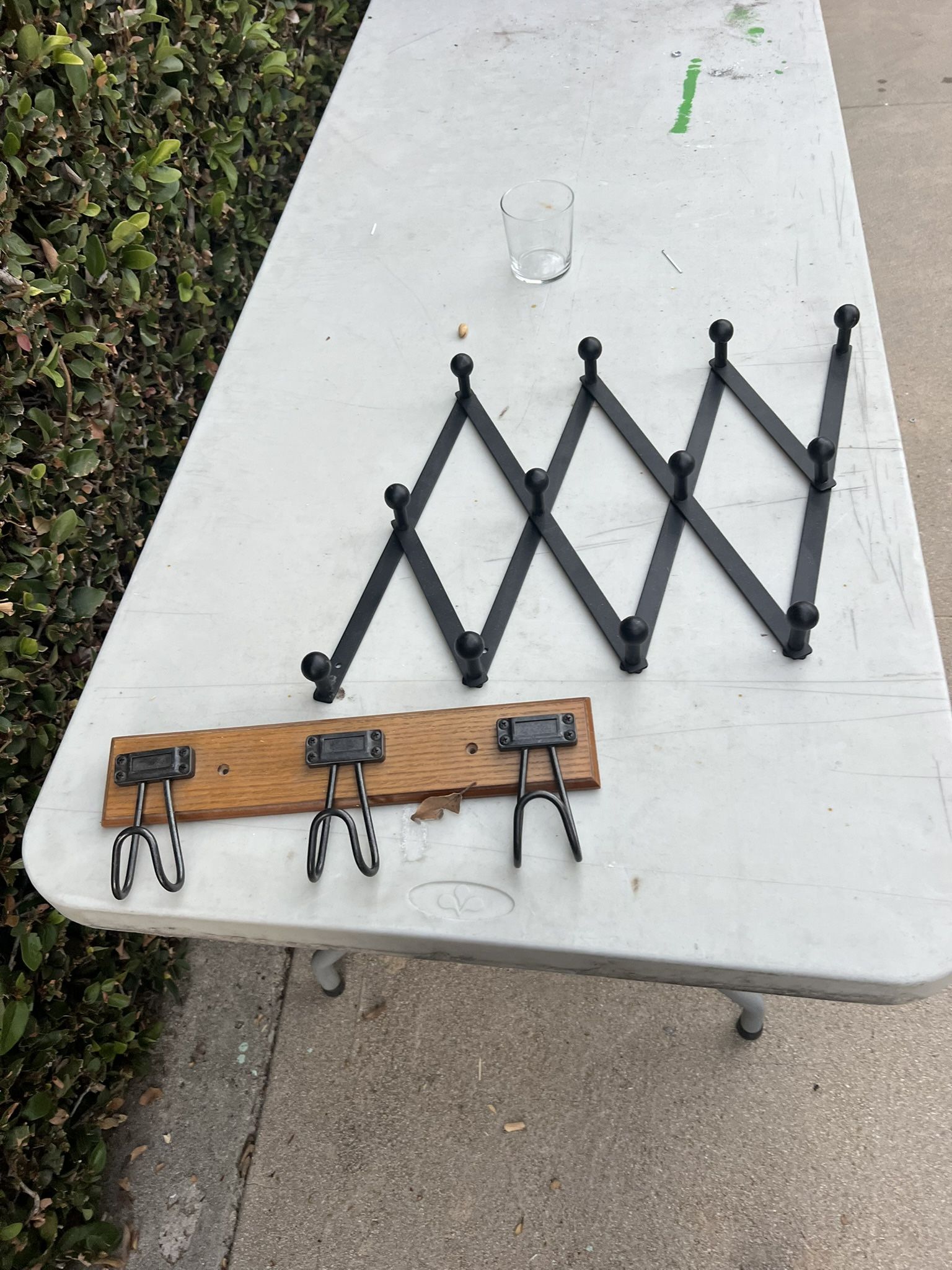 Two wall-mounted coat racks in good working condition. Includes: • Black metal accordion / scissor-style expandable coat rack • Wood wall rack with black metal hooks Both are sturdy and functional. Normal signs of use but no damage. Great for entryway, mudroom, office, studio, or workshop. Selling together.