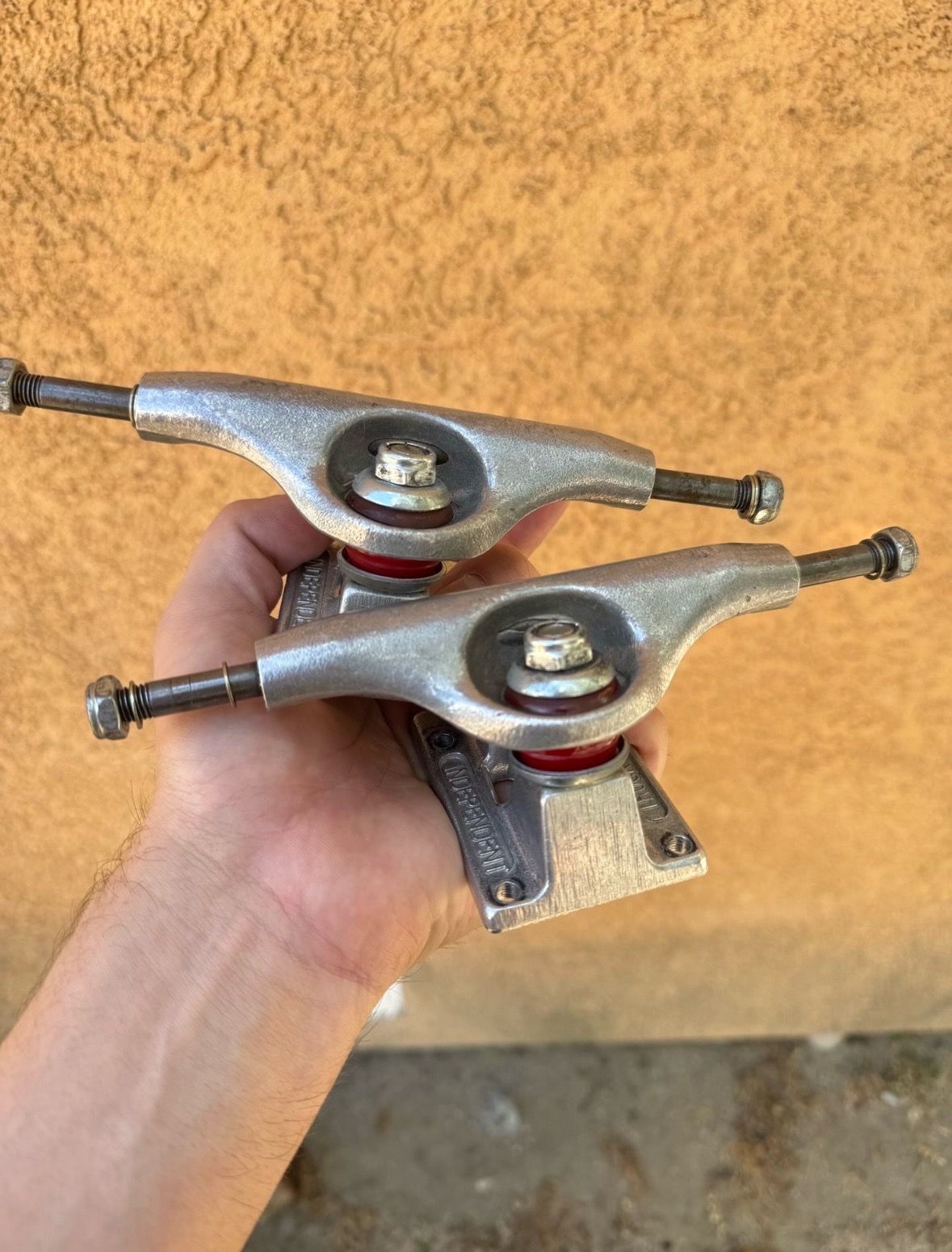 I got a pair of vintage Independent brand Trucks Still in excellent condition They’re size 129 lows (perfect for boards between 7.75 - 8) a size they don’t make anymore which makes them pretty rare What also makes these rare is that they’re USA made & still have the cross logo on them and all of the current Indy trucks on the market today are all made in china & had the cross logo removed from all of their products. They’re listed around EBay for $100 so make me an offer but don’t low ball me or waste my time cause I’ll block you. Serious offers only.