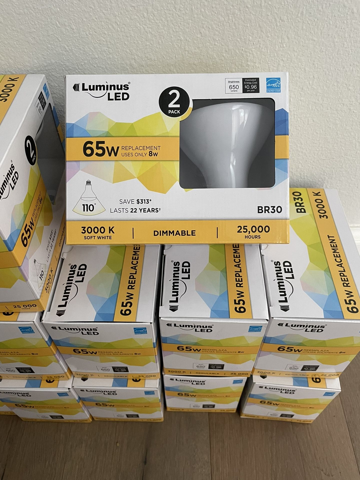 I have 15 boxes of brand new, unused LED 65W overhead lightbulbs. There are two bulbs per box, so 30 total bulbs. Retail goes for $10-15, I’m asking $100 for all 30 bulbs, or $7/box Provides a great way to save on energy, very long lasting, dimmable, and has a very inviting soft white light of 3000k. Lights, light bulb, home