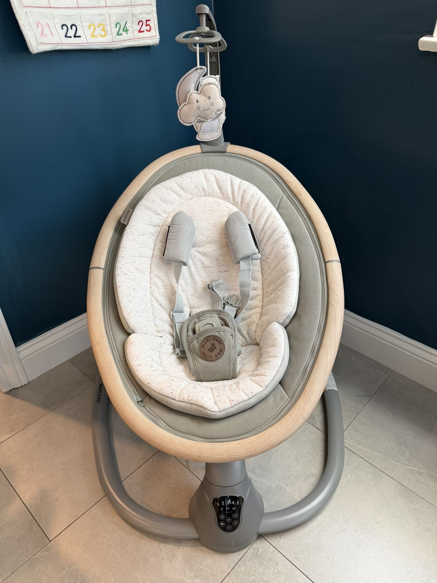 Lightly used and in great condition. $120 obo Featuring EcoCare––premium, 100%-recycled fabric made from plastic bottles (exclusive of 2 felt mobile toys) 360° seat rotation so the two of you can keep an eye on each other Optional automatic motion detection activates swing when baby needs soothing Intuitive touch screen panel controls 5 swing speeds plus 12 melodies and nature sounds 2 recline positions for customized comfort and 5-point harness for security Strong yet lightweight at about 10 lbs. for easy portability Removable soft, cozy newborn inlay Easy to clean with machine-washable fabrics, including the inlay and cover Mobile with 2 felt toys for baby’s entertainment Sleek, modern design complements home décor For babies up to 20 lbs. Never let babies sleep in rockers, bouncers, or swings