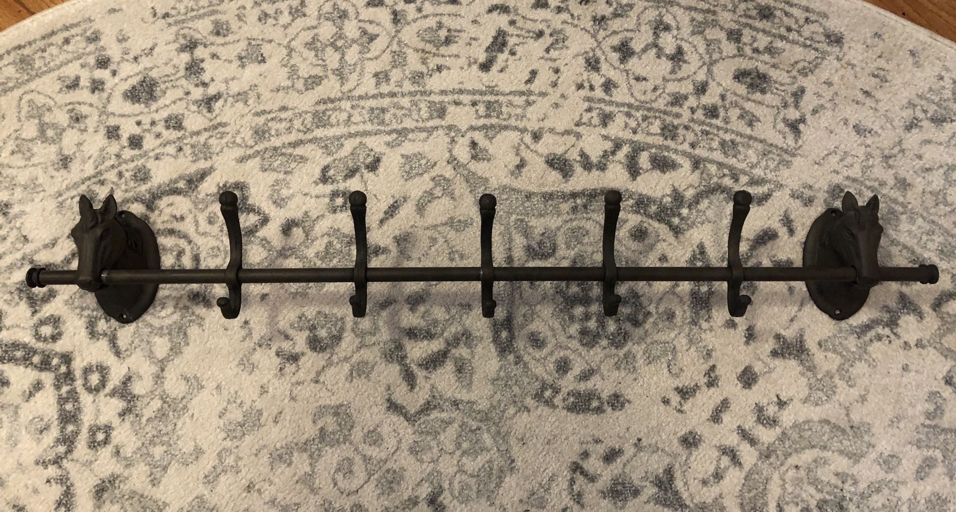 Heavy duty horse head coat rack. All metal and black in color. Really cool decor piece but moving and just don’t have a need for it.