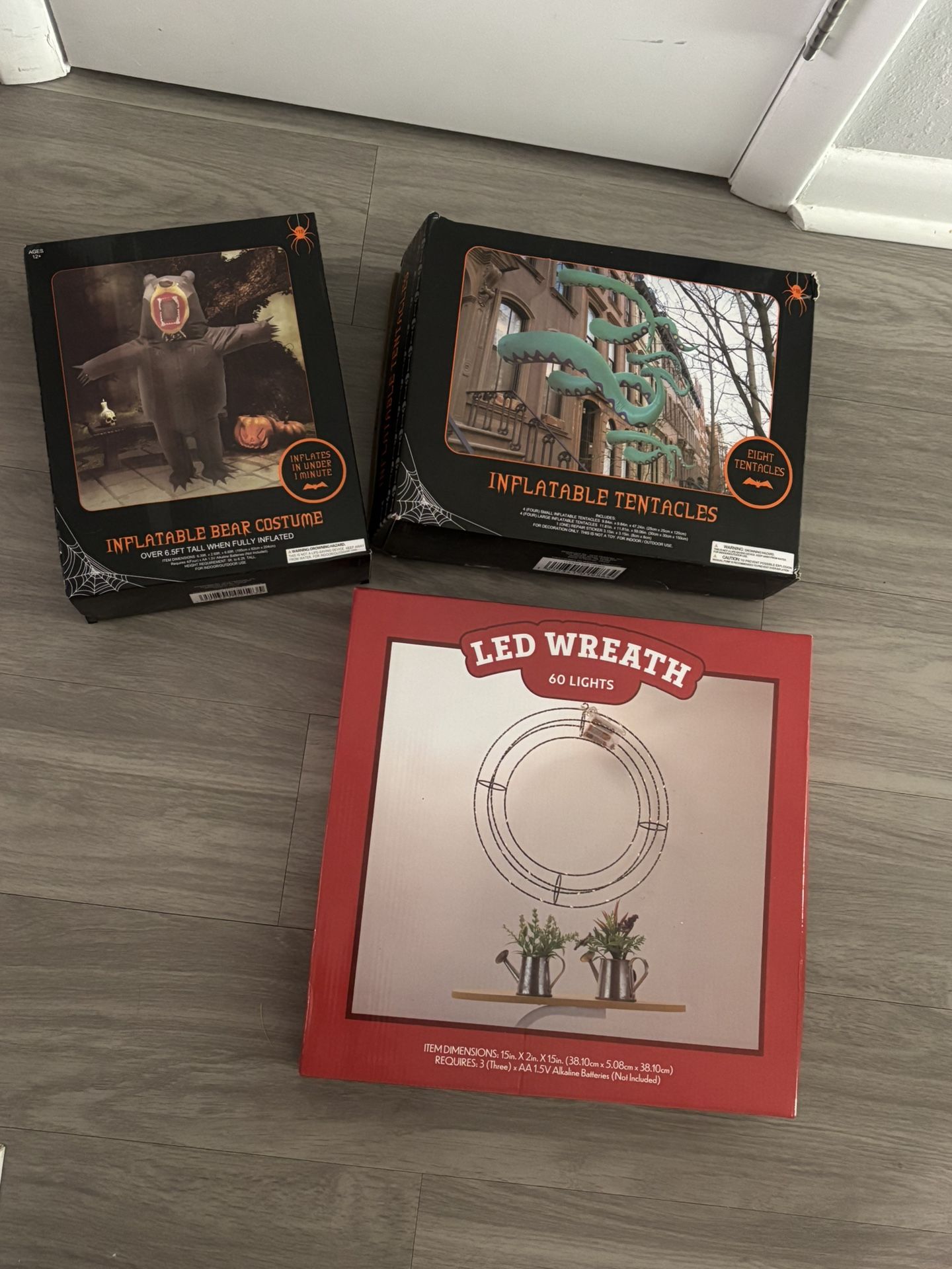 Bear inflatable costume brand new $15 Tentacle inflatable decoration $18 brand new im box Light wreath is $5 brand new in box