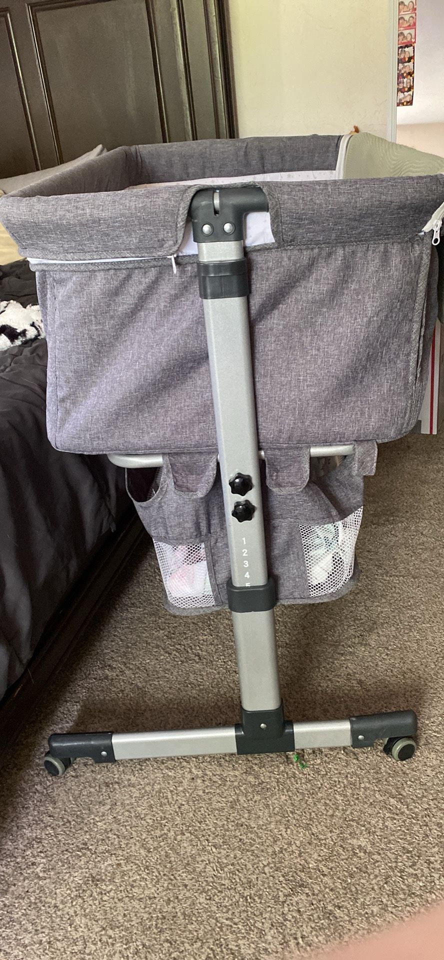 Nice convenient bedside bassinet. It is a rolling bassinet, it has extra storage underneath, you can adjust the height of the bassinet higher and lower. The bassinet was used for a little under three months . I need this gone soon as possible.