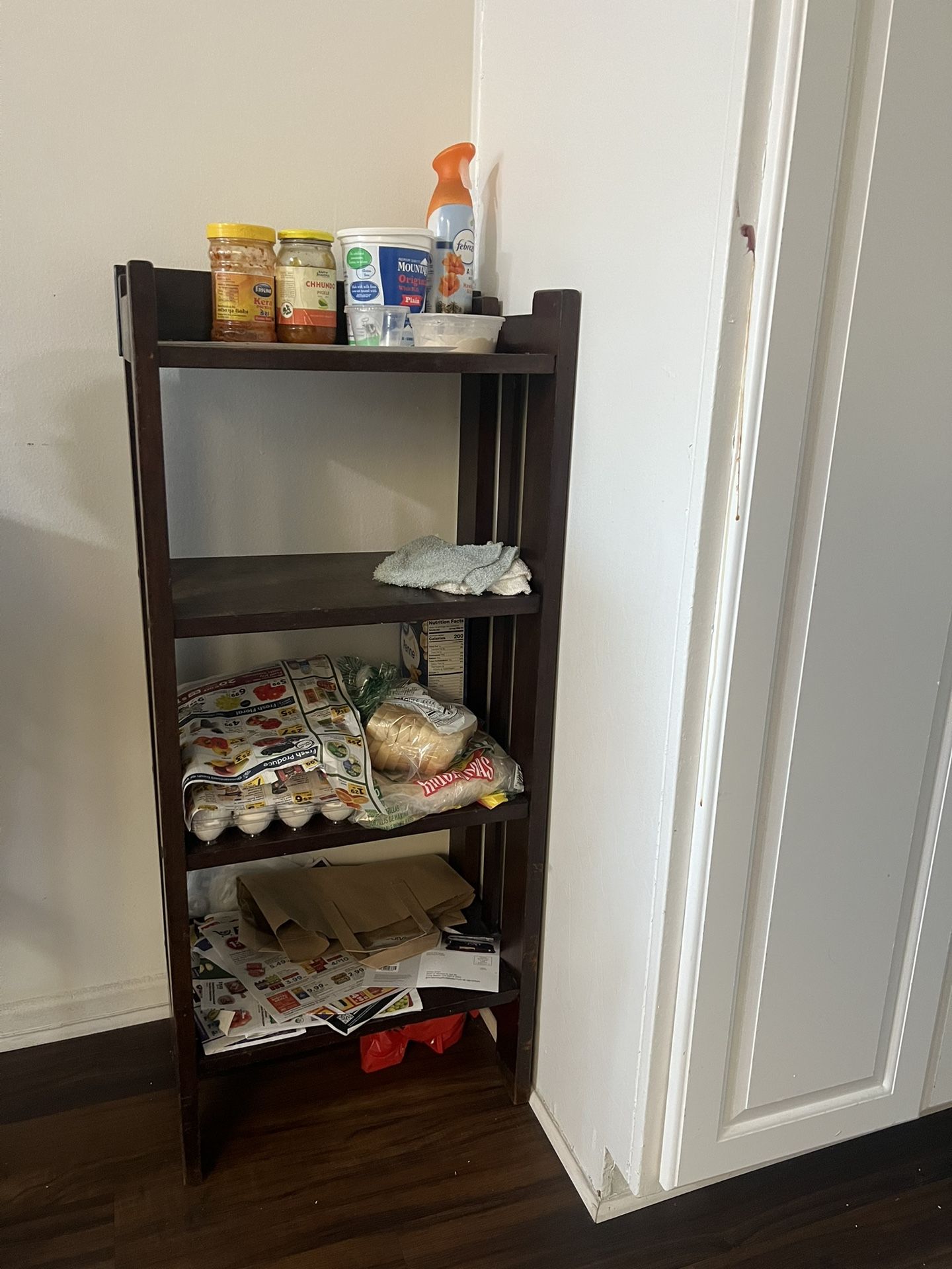 Selling a sturdy 4-tier wooden bookshelf in a dark espresso finish. This is a compact and versatile piece that works great for books, kitchen storage, or as a pantry rack. Features: • Design: Sleek, open-slat sides for a modern look. • Storage: Four spacious shelves to help organize your home or apartment. • Build: Lightweight yet stable and easy to move. • Versatility: Perfect for a bedroom, home office, or used as extra kitchen storage (as seen in photos).