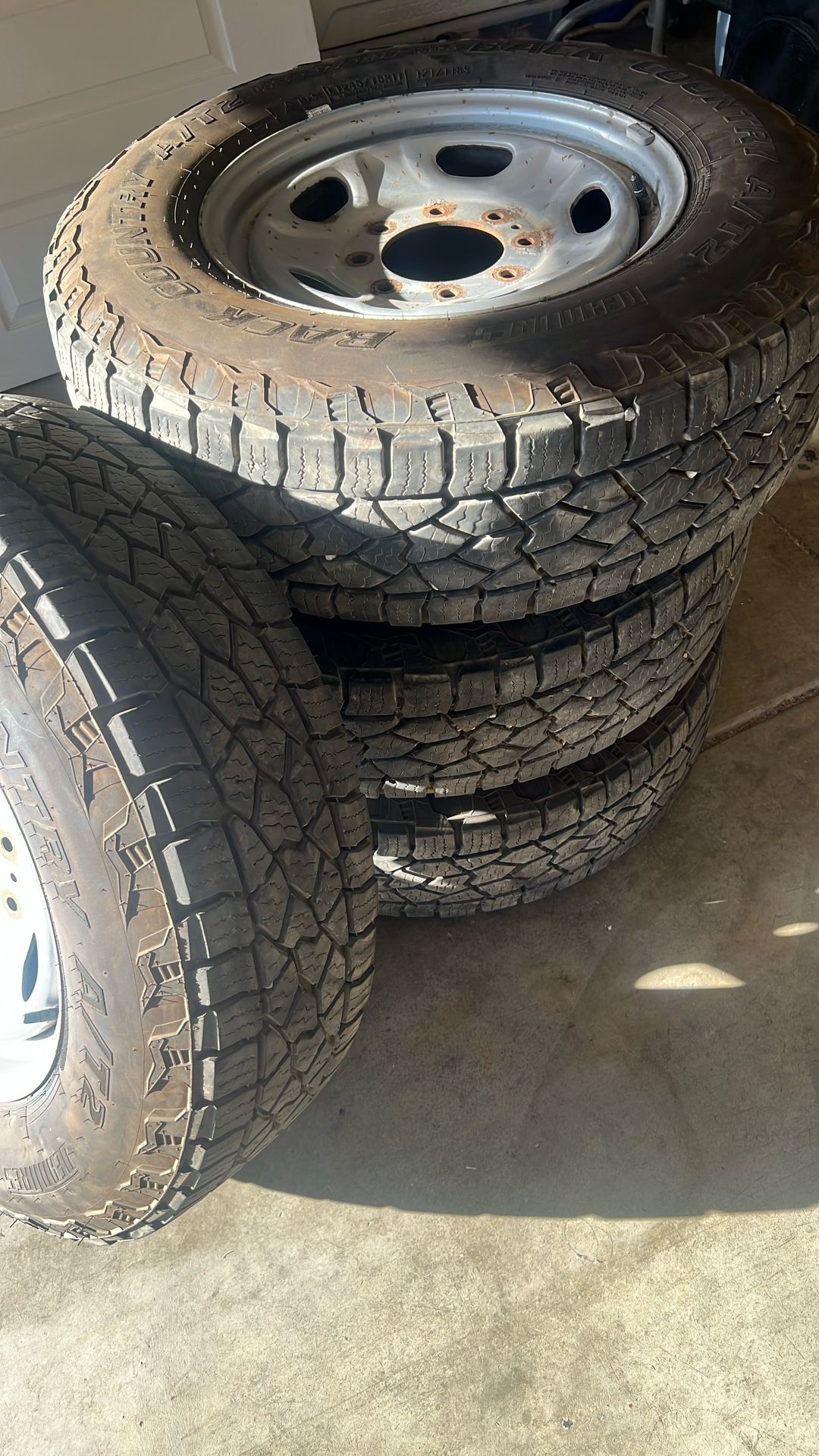 4 back country tires Lt245/75r17 A/t2 like new tires. rims is 8 lug 200 obo shoot me offer needs to go asap fits any size 17in rim