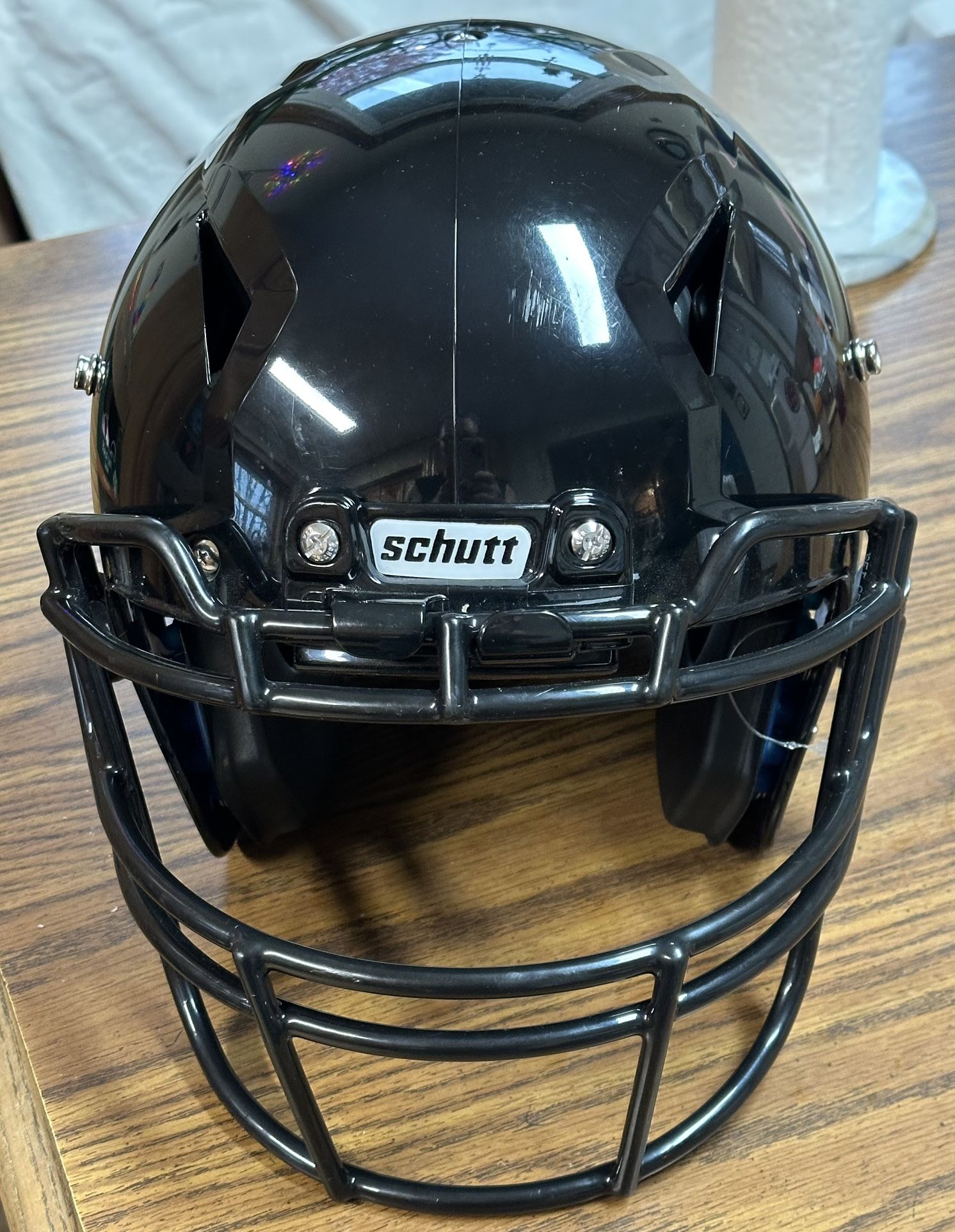 Black Schutt football helmet in excellent condition; black Schutt Youth Vengeance A11 football helmet with a face mask. ® • Features a sleeker, lower profile design which is lightweight for a comfortable feel. ® • Comes standard with a carbon steel guard and traditional loop straps. B • The helmet is designed for youth players. • The non-inflatable comfort liner provides a comfortable fit.