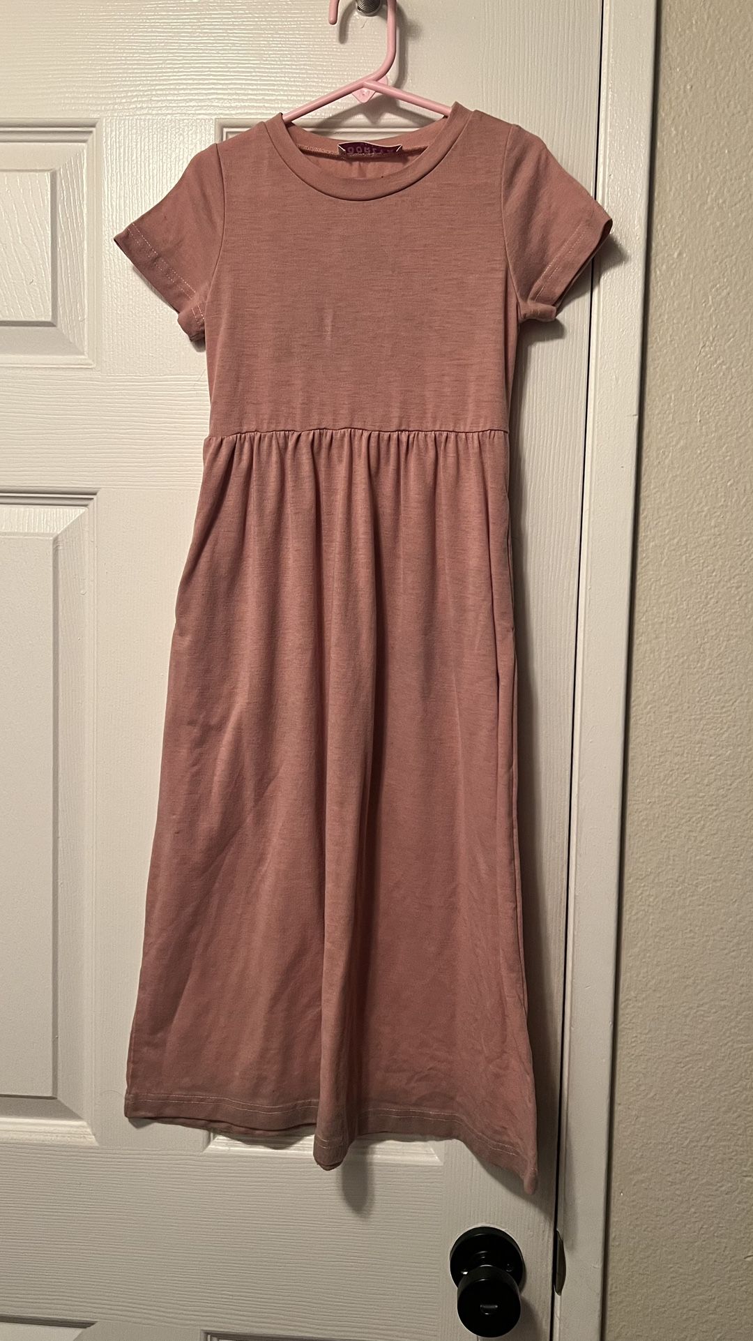 Little girls, blush pink dress with pockets. Very long, drags on the floor. Worn once for a wedding, bottom stained (shown in picture). Size 4-5.
