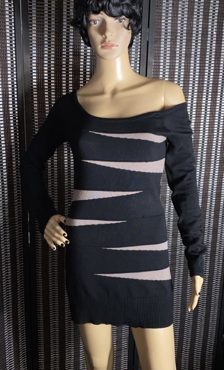 Xhilaration black and beige striped sweater dress In good condition! Size is XS, but fits up to a Medium. Stretchy, and hugs your curves. #stripeddress #bodycon #sweaterdress #stretchy #minidress