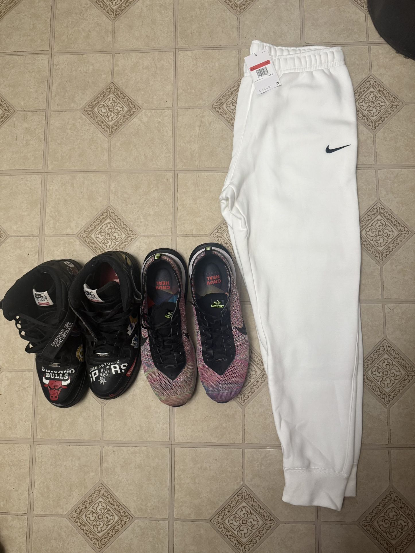 Supreme Air Force - used size 12 Nike flyknits- slightly used size 13 White nike sweatpants - New size Large