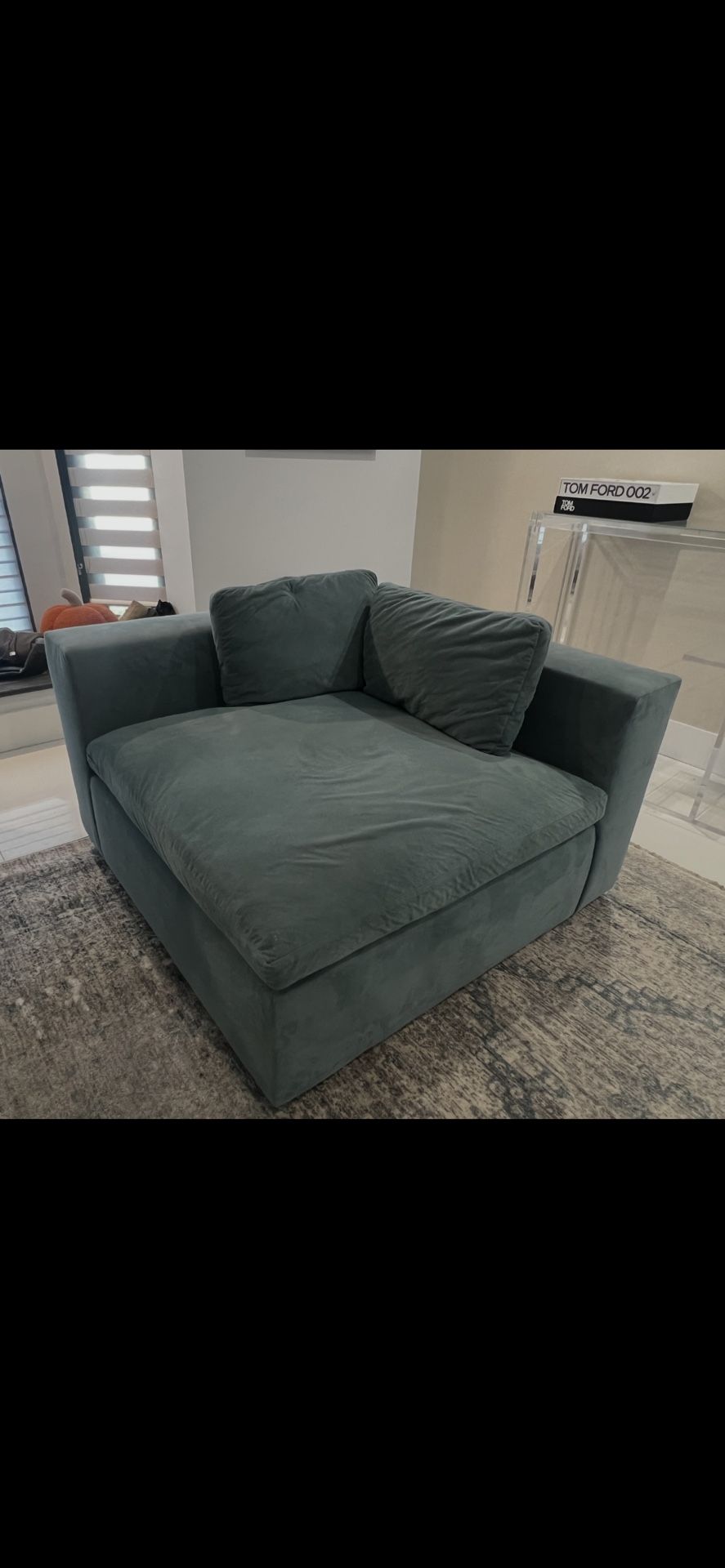 West elm brand corner couch, color: ocean Gently used, comes with two pillows. Material: smooth Velvet Measurement: W 43, D 43, H 26