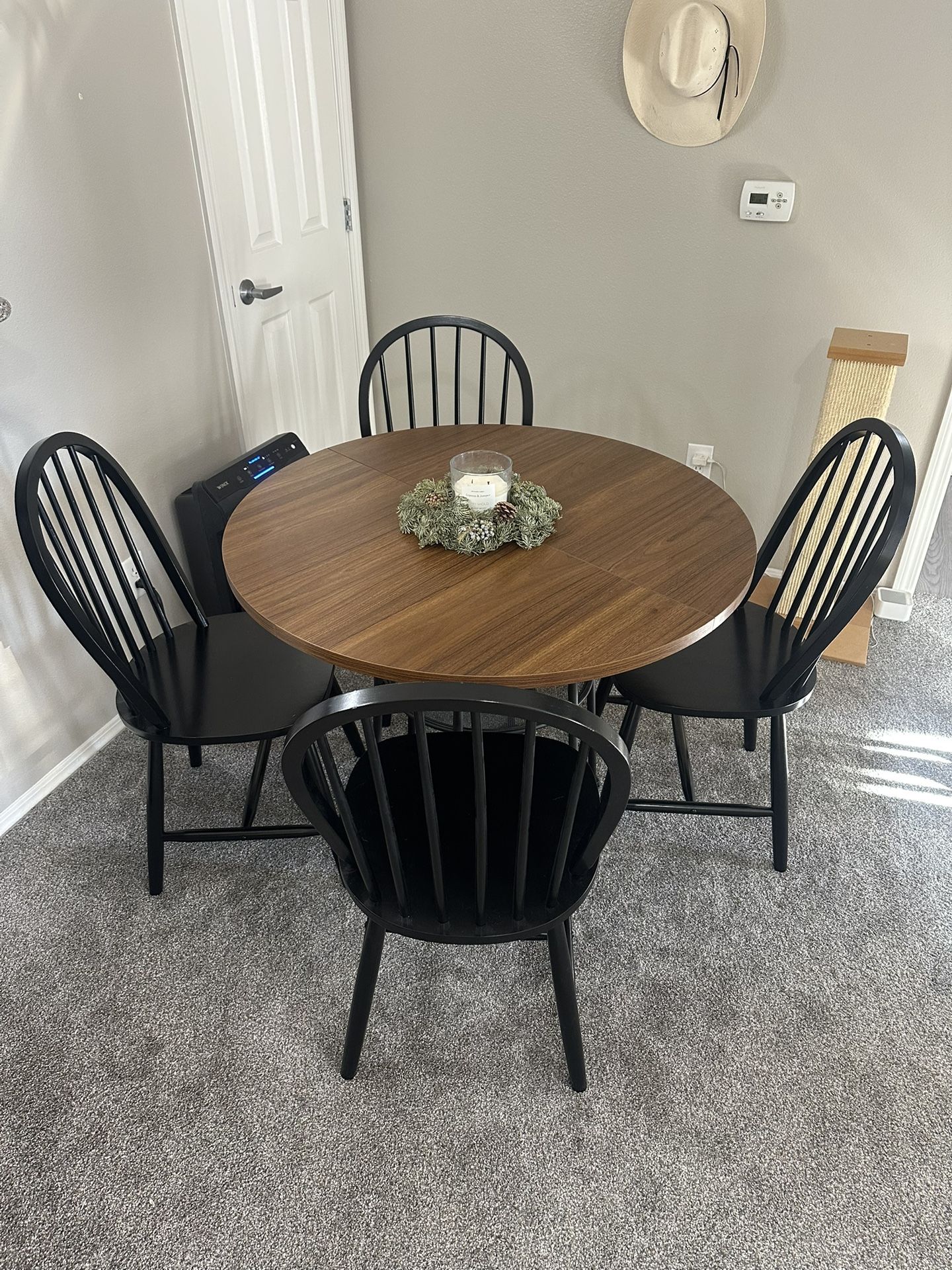 38.5” round wood dining table with black metal star shaped base. Well taken care of - no scratches or dings. Comes with 4 black wood dining chairs. Great for a breakfast nook or small dining area!