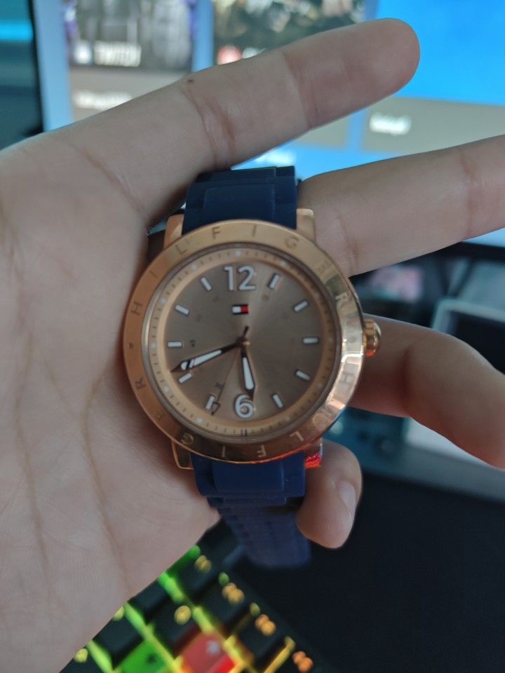 NEW TOMMY HILFIGER ROSE GOLD TONE,NAVY BLUE SILICONE BAND WATCH # 1781617
