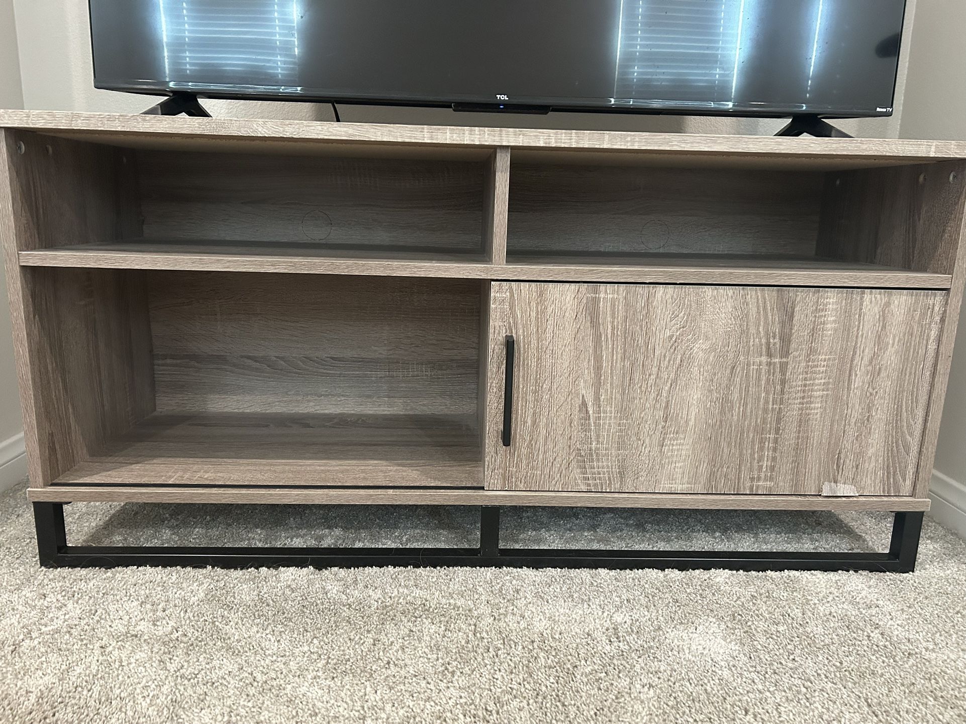 TV Stand. Good condition. Minor chip (pictured). 4 feet long- 2 feet tall.