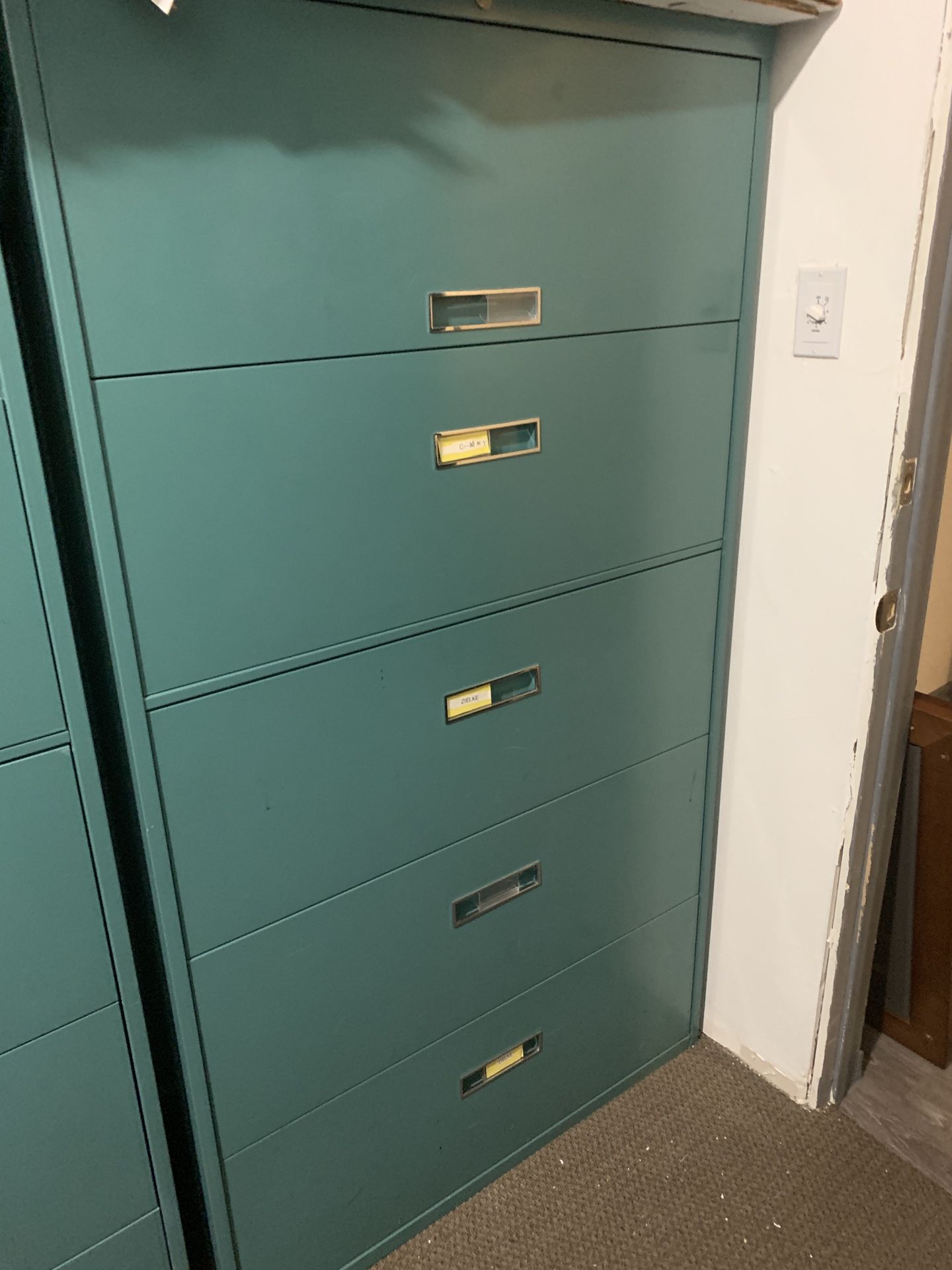 5’ high x 3’ wide. Five drawer file cabinets tasteful muted green. 3 available for $100 top drawer can be used as shelf.