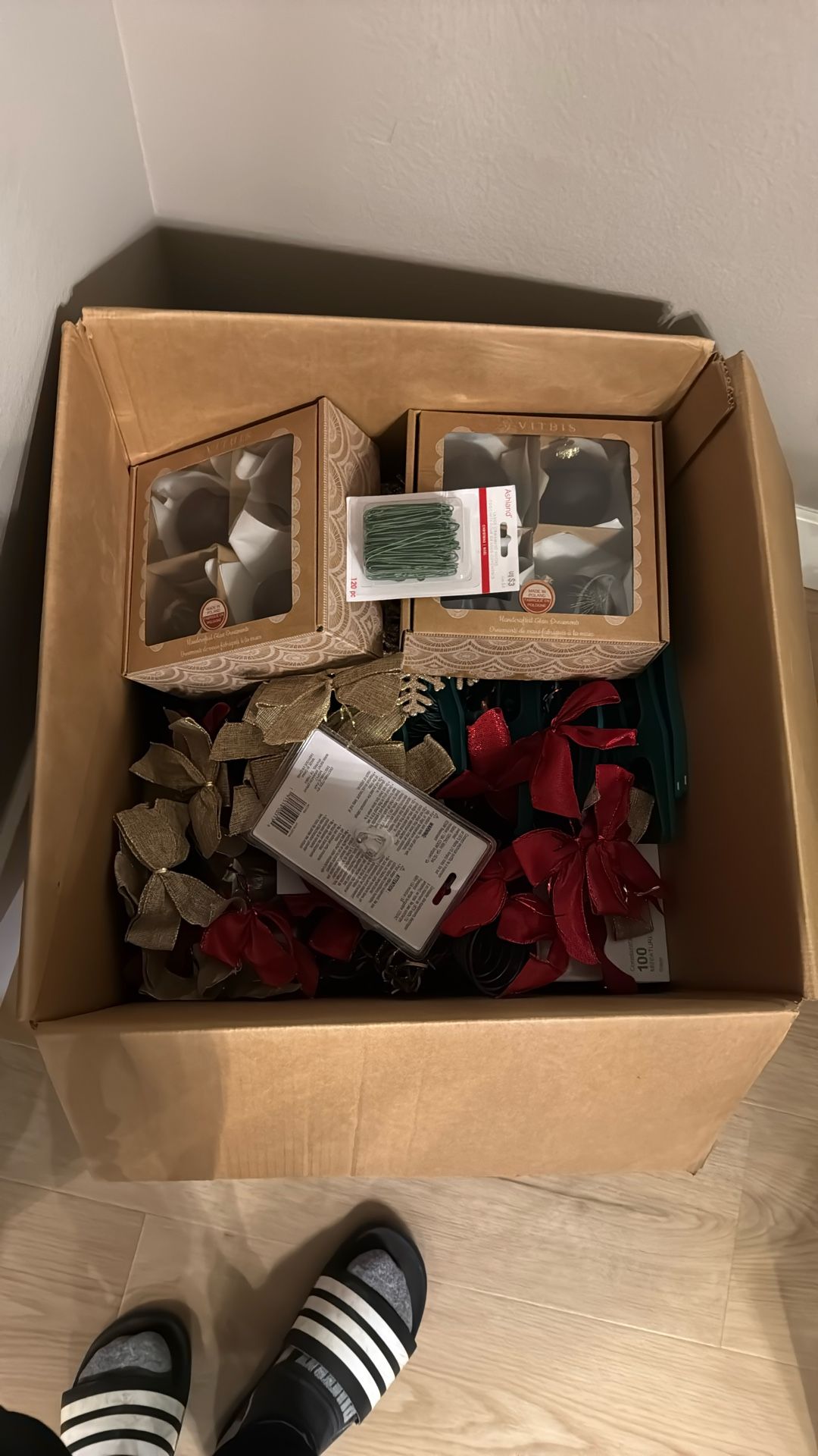Mostly lights 6-7 strands clear and white - sone ribbons, a tree topper and a few ornaments. Just cone get them!