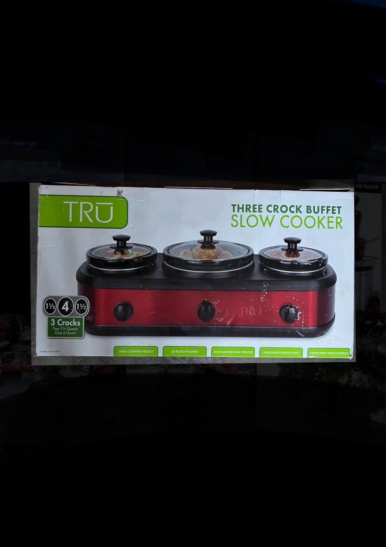 Never used or opened. Brand new. Rare find tru brand triple slow cooker. 1.5 qt/4qt/1.5 qt Brand new never used still in box. Perfect for gatheringss. Pick up in Jurupa Valley cash only no trades no holds please message when ready to pick up. $50 cash and it’s all yours