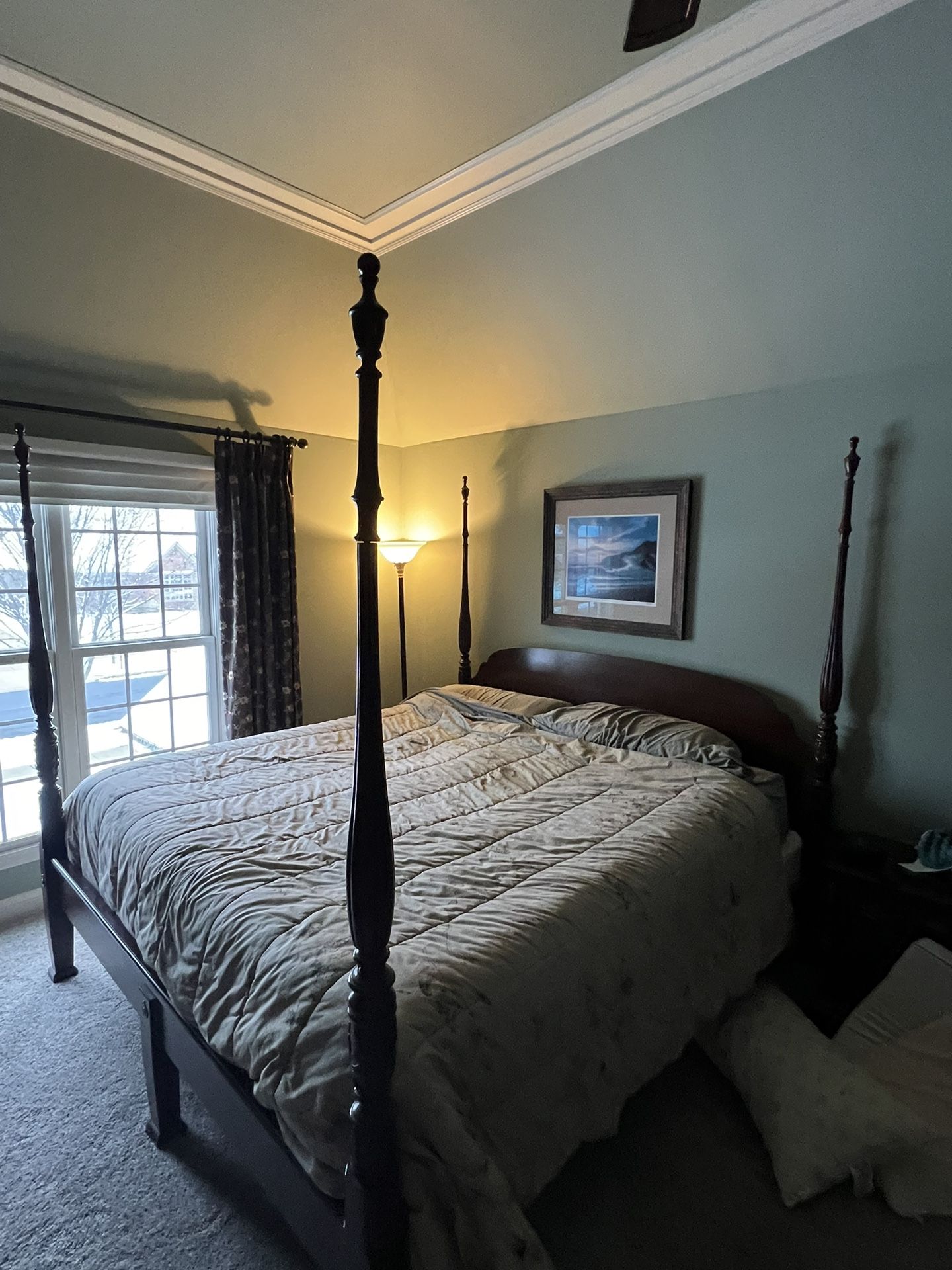 Full bedroom set, bed frame, night stand, dresser with mirror.